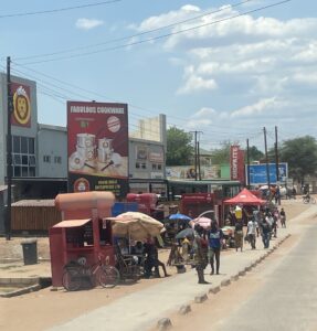 Je näher wir Lusaka kommen, desto auffälliger wird, dass die am Land sonst vorherrschende Subsistenz-Landwirtschaft größeren Feldern Platz macht, Landmaschinen ersetzen Spitzhacke und von Ochsen gezogene Pflüge. Wir sehen Bewässerungsanlagen, Abstellplätze für Landmaschinen (mit Solardächern!) und immer mehr Schilder der großen Saatgut-Konzerne („SeedCo“, „Afriseed“, „Synergy“ und „Pioneer“). Verarbeitungs-Betriebe säumen zunehmend den Weg, die meisten werden offenbar in Form einer landwirtschaftlichen Kooperative betrieben, sodass wir hoffen, dass die Bevölkerung hier noch einen fairen Anteil an dem Ertrag der Ernte bekommt und nicht im (bescheidenen) Lohn einer indischen oder chinesischen Firma steht.
