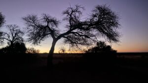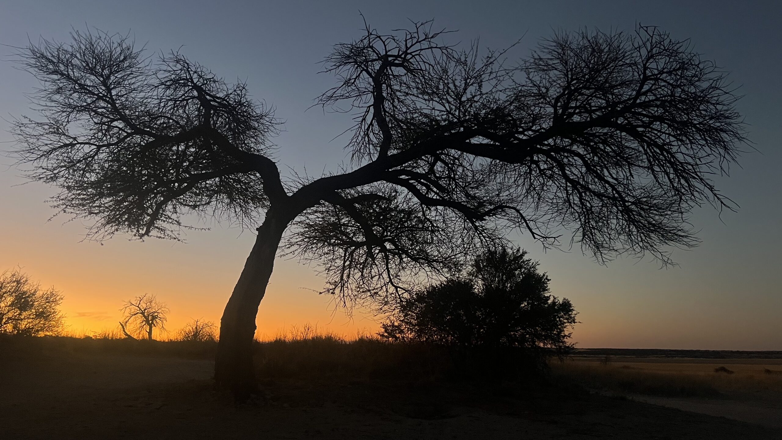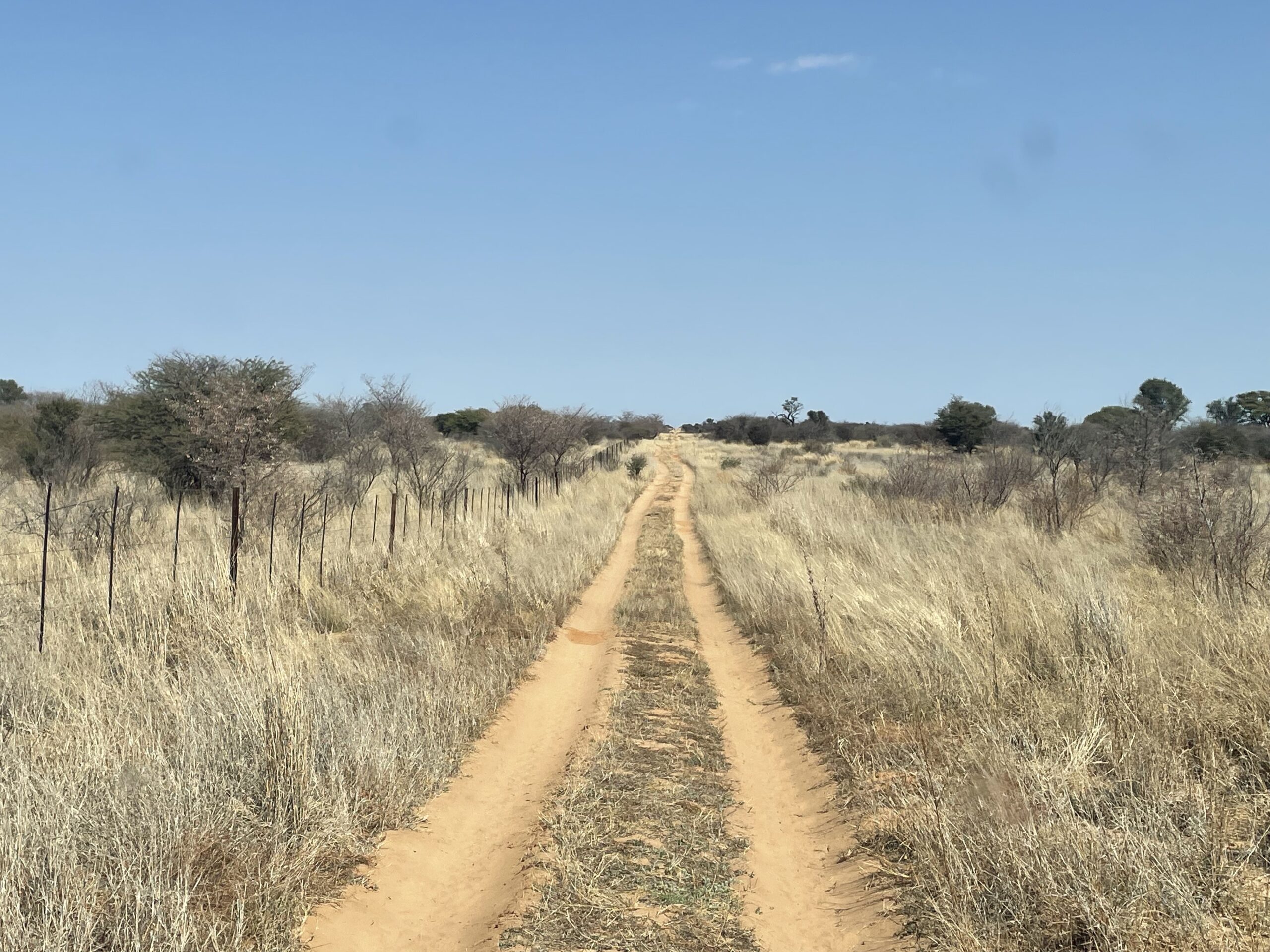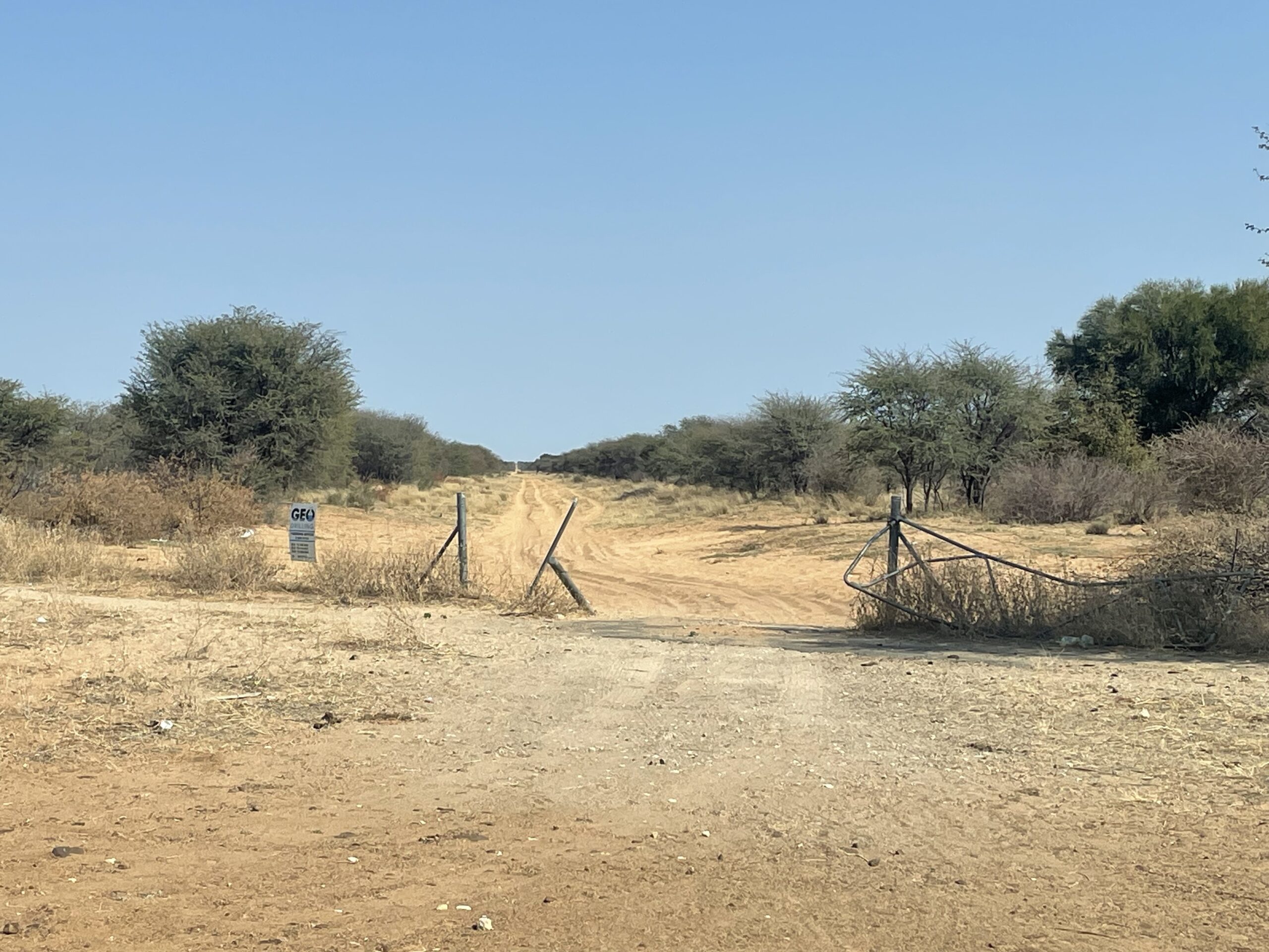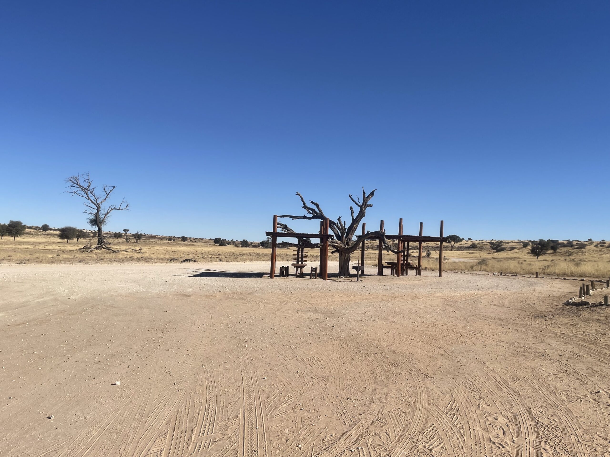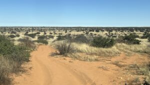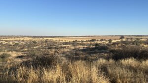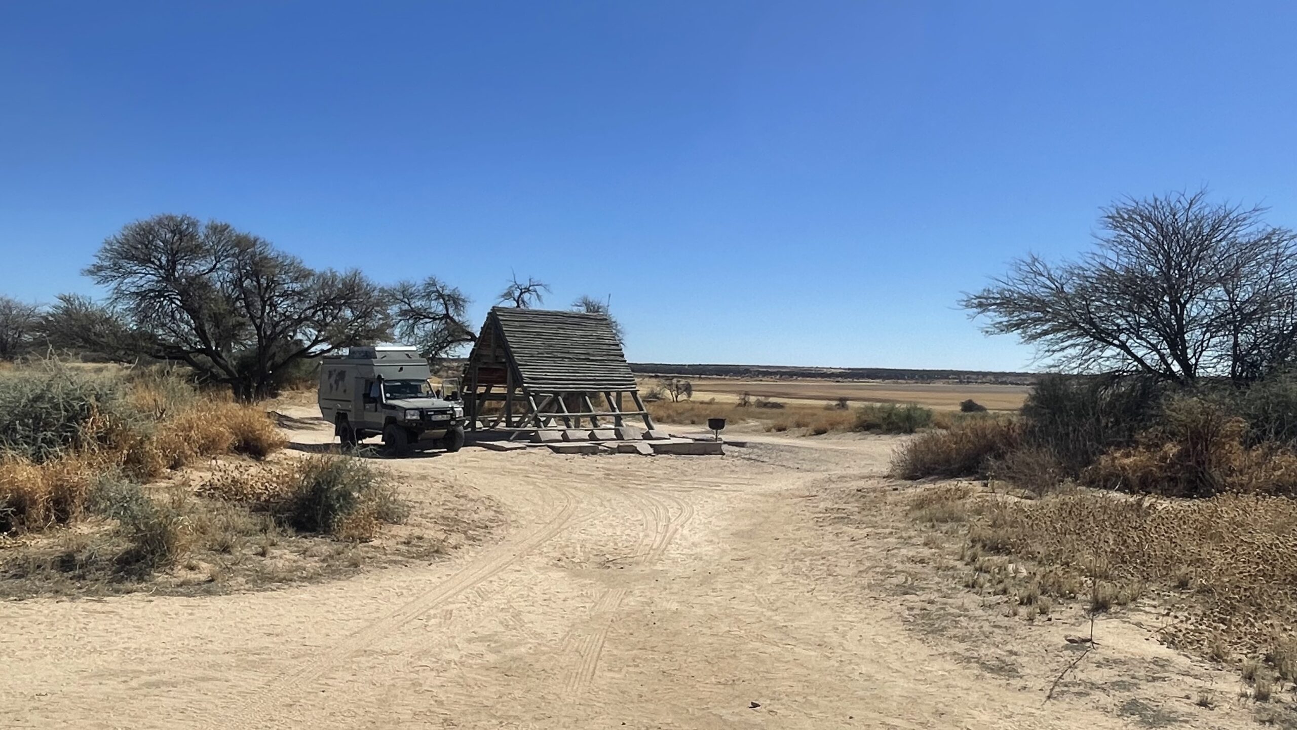 Nach den einsamen Tagen im Khutse Game Reserve steht uns eine lange Etappe bevor, weshalb wir so nah wie möglich an den Startpunkt der Trasse Richtung Mabuasehube-Sektor des Kalagadi Transfrontrier National Parks gelangen wollen. Unterkünfte gibt’s entlang dieser langen, schnurgeraden Strecke so gut wie keine. Daher werfen wir wieder mal einem Blick auf die iOverlander-App und entdecken kurz vor Sekoma den Eintrag eines wilden Camping Spots. Wir schauen uns die beschriebene Stichstraße an und gelangen an einen ruhigen Platz abseits der Hauptstraße. Das passt gut, hier verbringen wir die Nacht, die tatsächlich völlig ungestört verläuft.