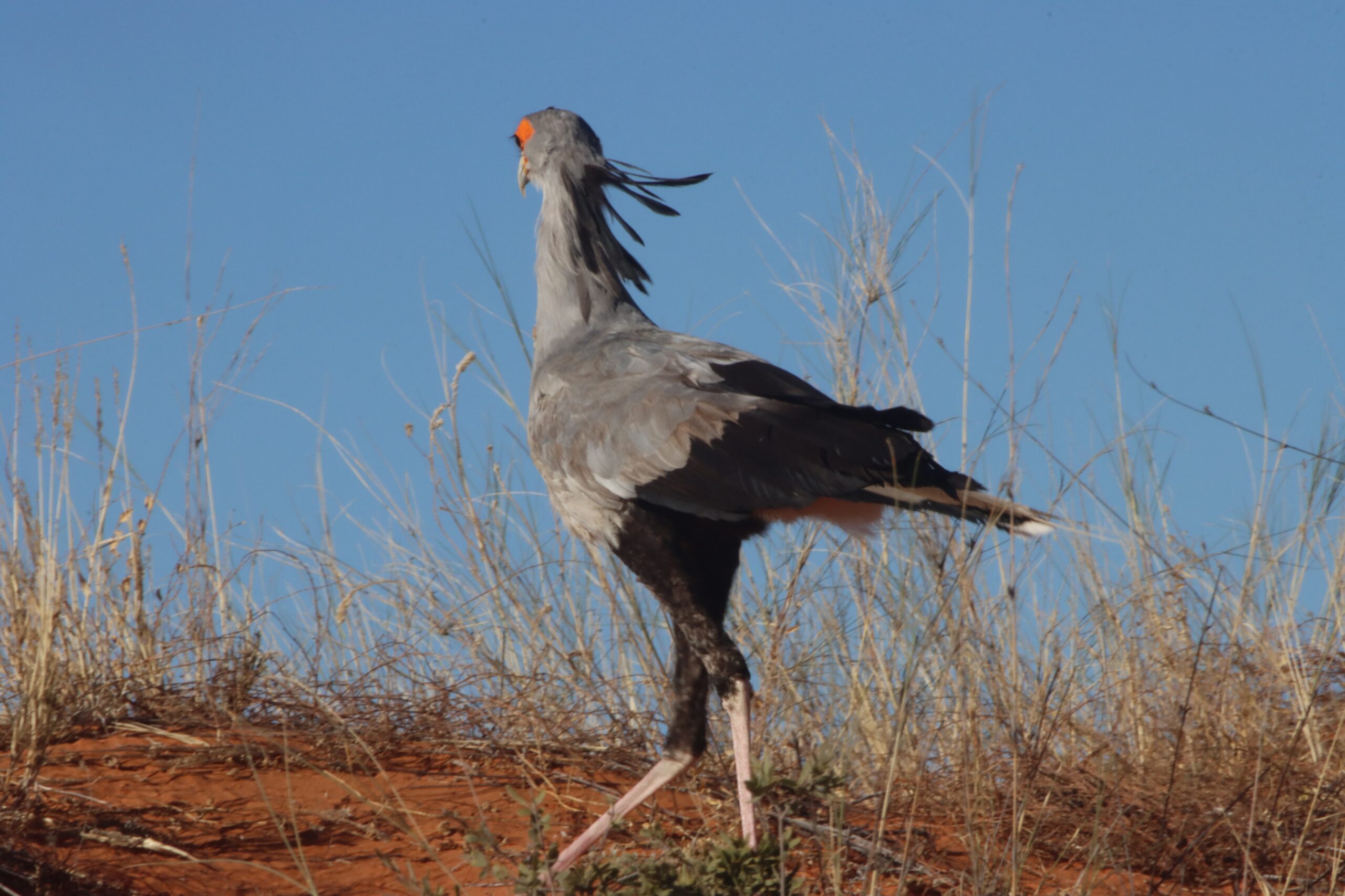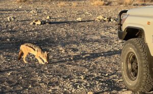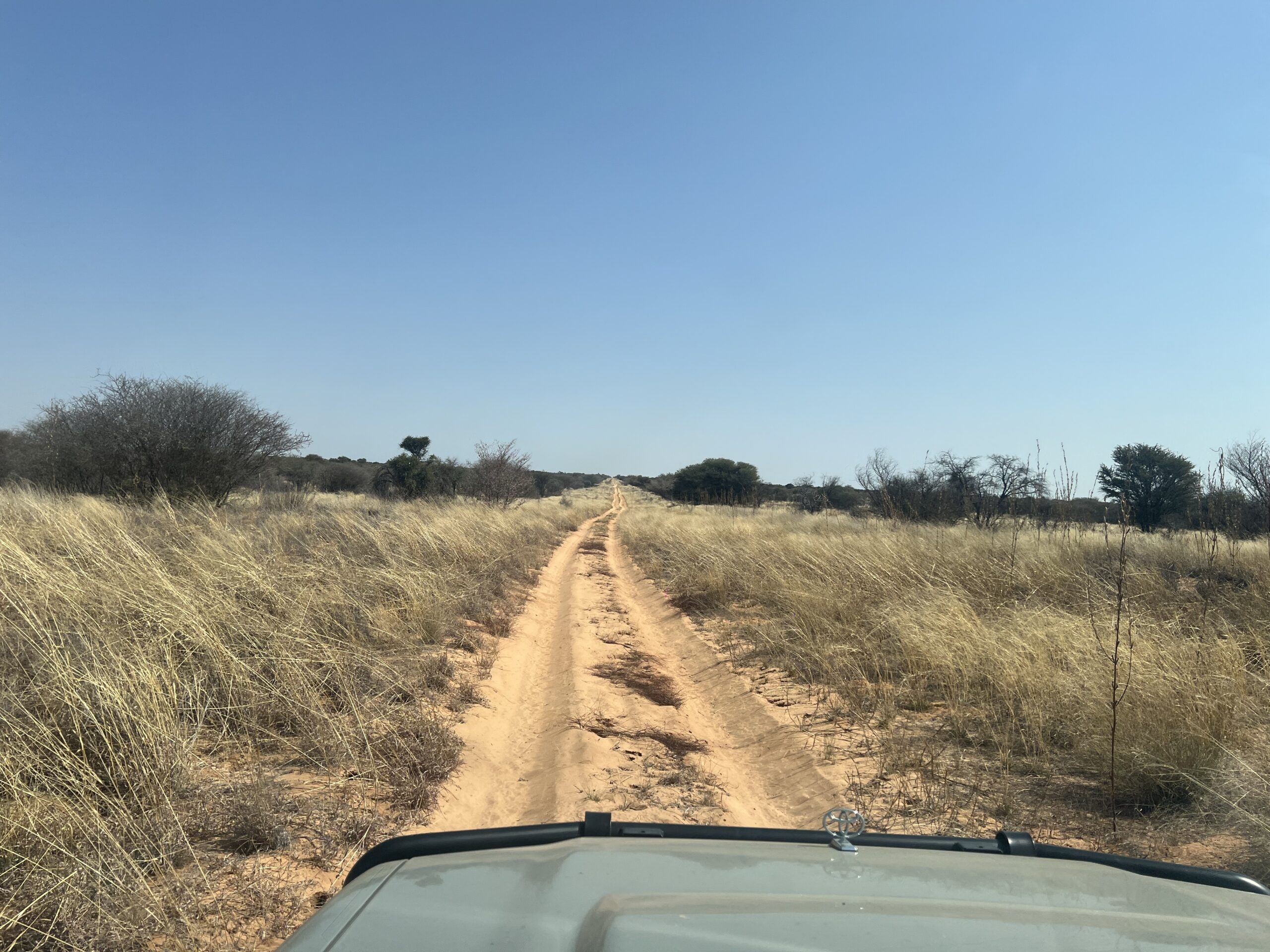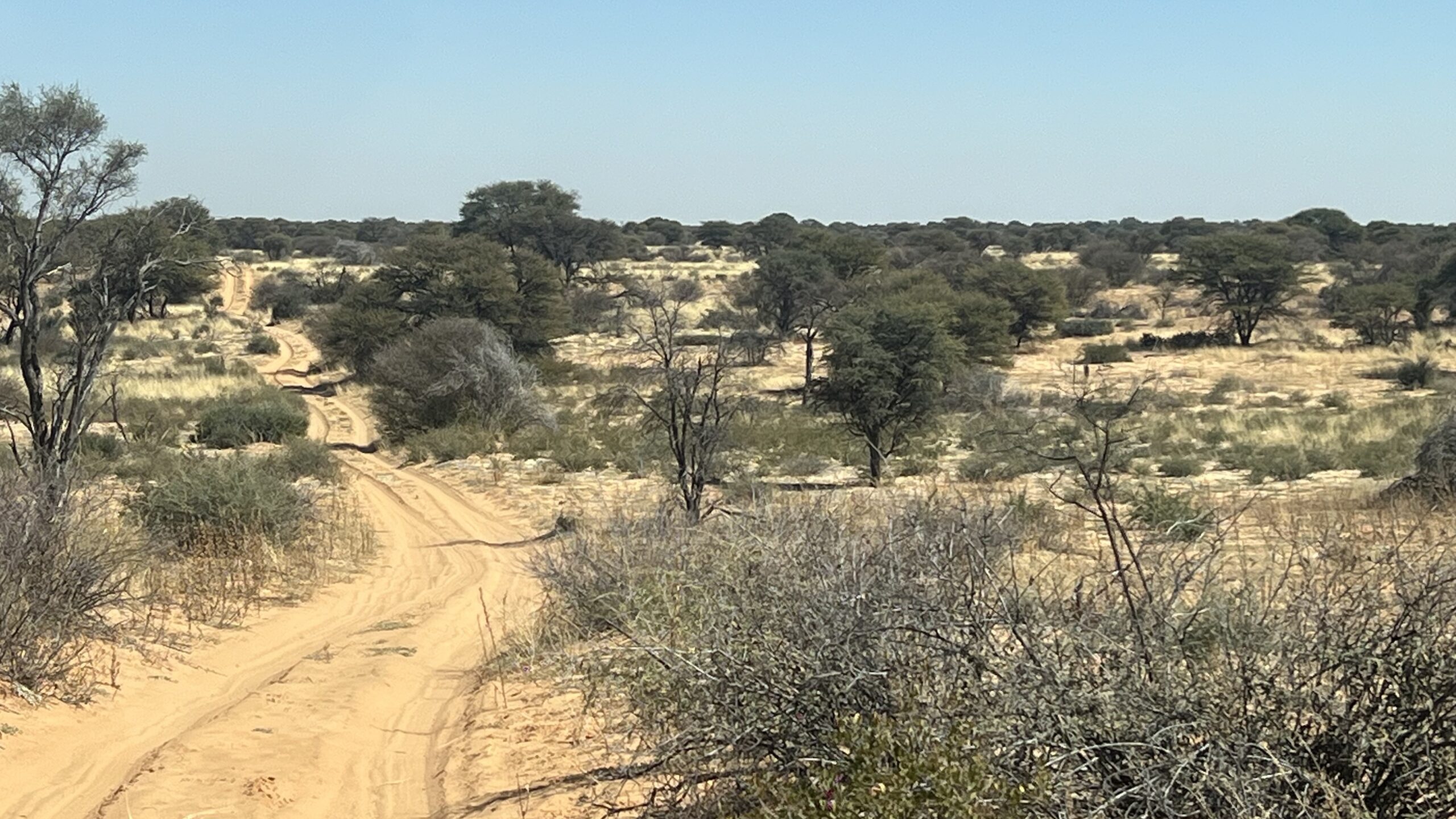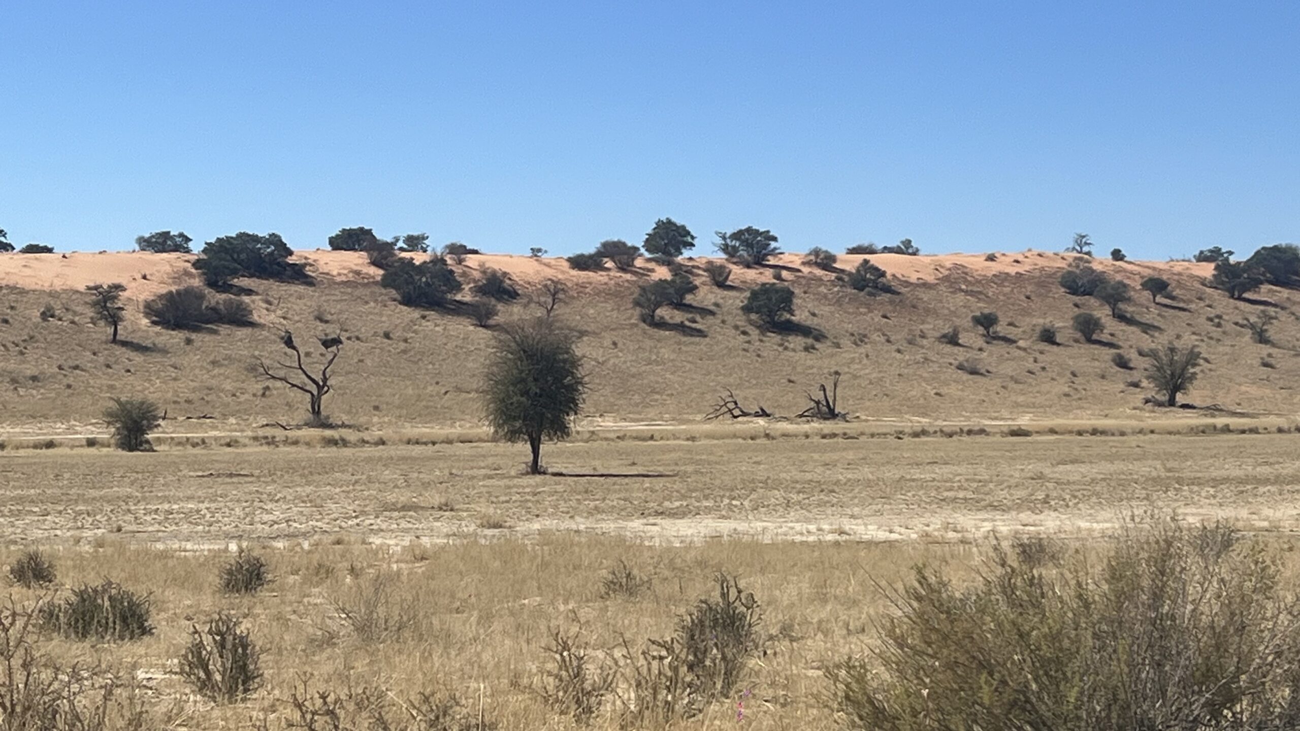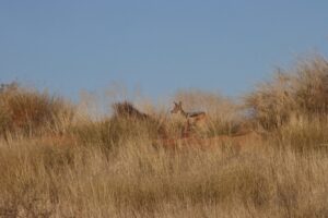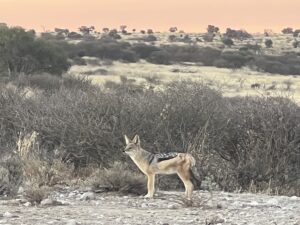 Für den Morning Drive queren wir hinüber ins Auob-Tal. Die Staubfahne, die Luna auf der grauen Gravel Road aufwirbelt, steht wie Nebel in der Morgenluft und verzieht sich erst ganz langsam. Auf der Überfahrt begegnet uns auf einer hohen Düne noch einmak ein Schakal. Die Landschaft ist eine schöne Abwechslung zum Nossob-Tal und bringt Ein-und Ausblicke über die weitläufige  Dünenlandschaft. Ansonsten bleibt es auch im Auob- Tal tiermäßig eher ruhig und weit hinter unseren Erwartungen.