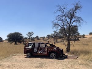 Wir passieren das kultige „burnt car“, das Reisende mit zahlreichen Stickern und sogar T-Shirts und Puppen dekoriert haben. Ab nun wird der von der Sonne aufgeheizte Sand immer weicher und tiefer. Die Dünenkämme werden höher und auch steiler, sodass Martin immer öfter die Untersetzung und die Sperren einsetzen muss. Es wird Zeit, einen Übernachtungsplatz zu suchen.