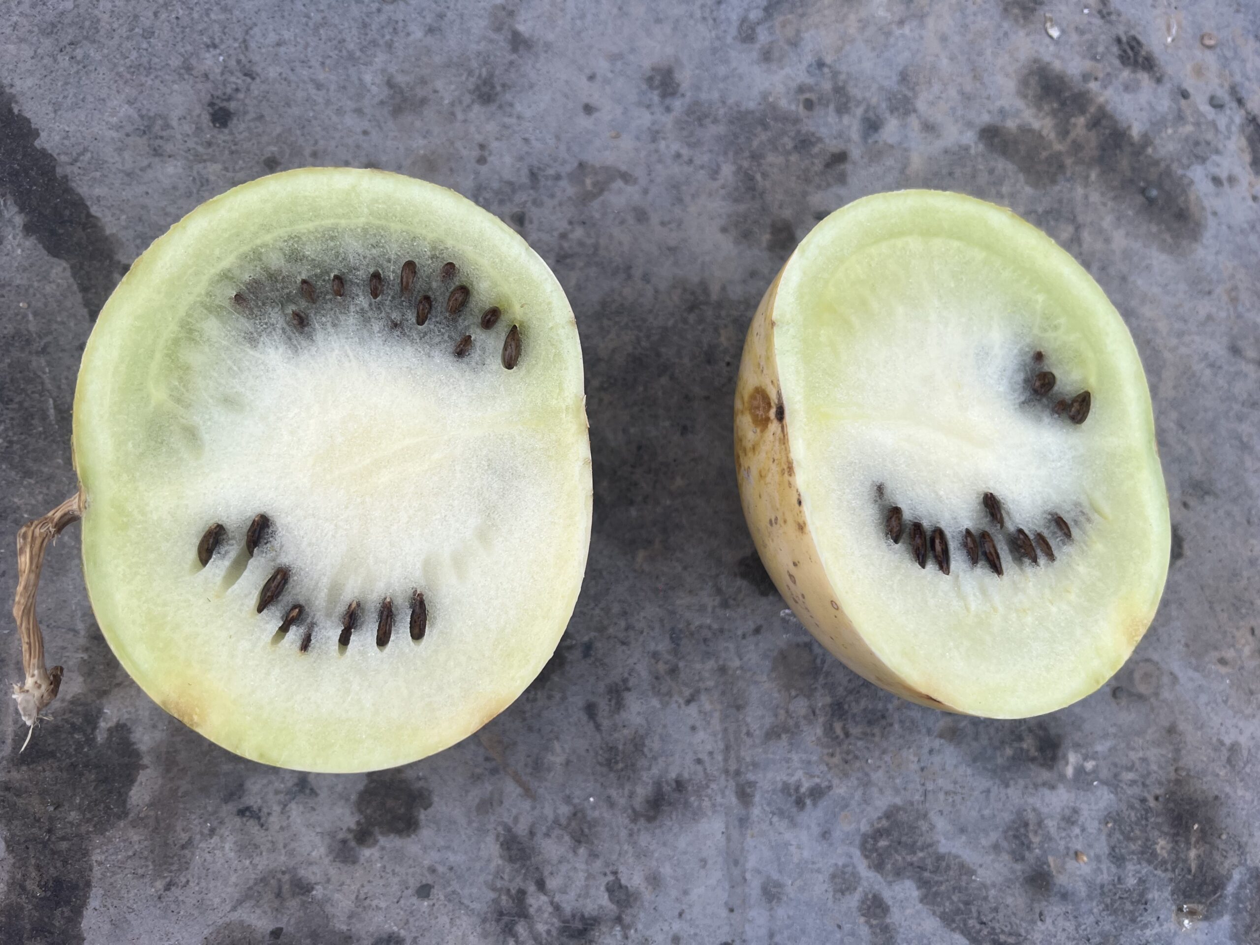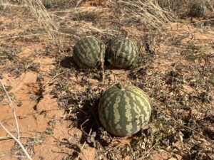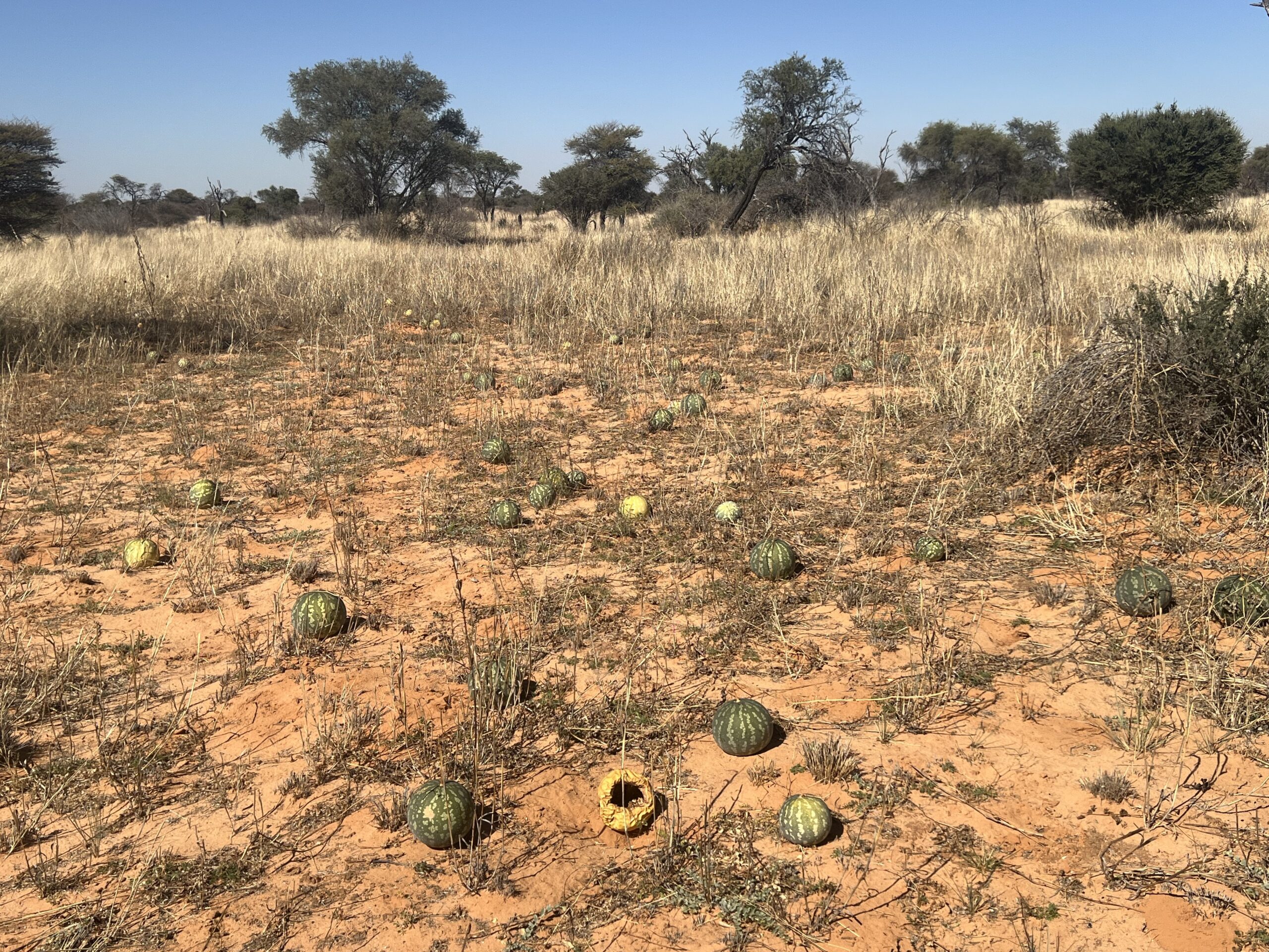 Für die Transferfahrt von Mabuasehube (Botswana) nach Nossob (Südafrika) begeben wir uns auf den Boso-Trail, den man ohne separates Permit und in beide Richtungen befahren darf. Die anderen beiden Trails sind one-way, erfordern ein Permit, und es müssen zumindest zwei Autos gemeinsam fahren. Grundsätzlich könnte man die 173 Kilometer als Tagesetappe anlegen, aber wir machen es verteilt über zwei Tage mit einmal Wildcamping. An der Strecke durch den Busch öffnen sich immer wieder Pfannen und Lichtungen. Je weiter nach Westen wir gelangen, desto lichter wird der Busch und desto mehr rote Dünen tauchen auf, dazwischen immer wieder die lustigen Ansammlungen von grünen und gelben Buschmelonen. Unvermittelt vermeldet der Steirer hinter dem Lenkrad: „Wia a Küabisfölllld daham! A Blutsa nem em ondan!“ (hochdeutsch: „Jö schau, ein Feld voll dicht aneinander gereihter Kürbisse! Wie zu Hause!“). Neugierig, wie sie wohl innen aussehen, sammeln wir zwei Exemplare ein, um sie später zu schlachten. Unsere Recherche nach stellen die fruchtigen Kugeln die primäre Wasserquelle für die Tiere dar, da bei den Salzpfannen oft nur salzhaltiges Wasser verfügbar ist. Zweiundzwanzig der Melonen haben zudem in etwa den Energiewert von einem Kilogramm Fleisch. Sie reifen im Winter und sind dann über Monate hindurch genießbar. Mahlzeit!