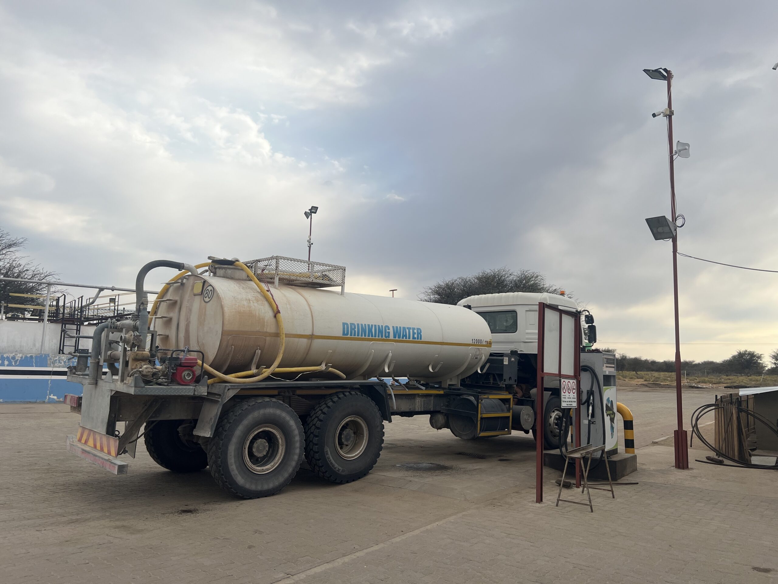 Früh morgens nehmen wir rasch die letzten 10km zur Tankstelle in Sekoma. Während Martin tankt, kümmere ich mich schon mal um Holznachschub und verstaue die diesmal riesigen Pakete sicher in der Dachbox. Leider funktioniert die Wasserleitung am Shop nicht, doch die hilfsbereiten Shop-Mitarbeiter weisen auf den Wassertanklaster direkt hinter Luna. Sie hatte selbst gerade Trinkwasser in ihre 5l Kanister gepumpt. So ein glücklicher Zufall! Der Fahrer ist gerne bereit, uns auch ein paar Liter der hier sehr wertvollen Fracht zu überlassen. Wir bedanken uns und erkundigen uns nach dem Preis, worauf der Fahrer jedoch abwehrend winkt – das finden wir nun doppelt nett, denn die ganze Gegend scheint wegen des salzigen Grundwassers auf diesen LKW angewiesen zu sein. Überall sehen wir die markant grünen 500 Liter-Tanks, die befüllt werden wollen.
