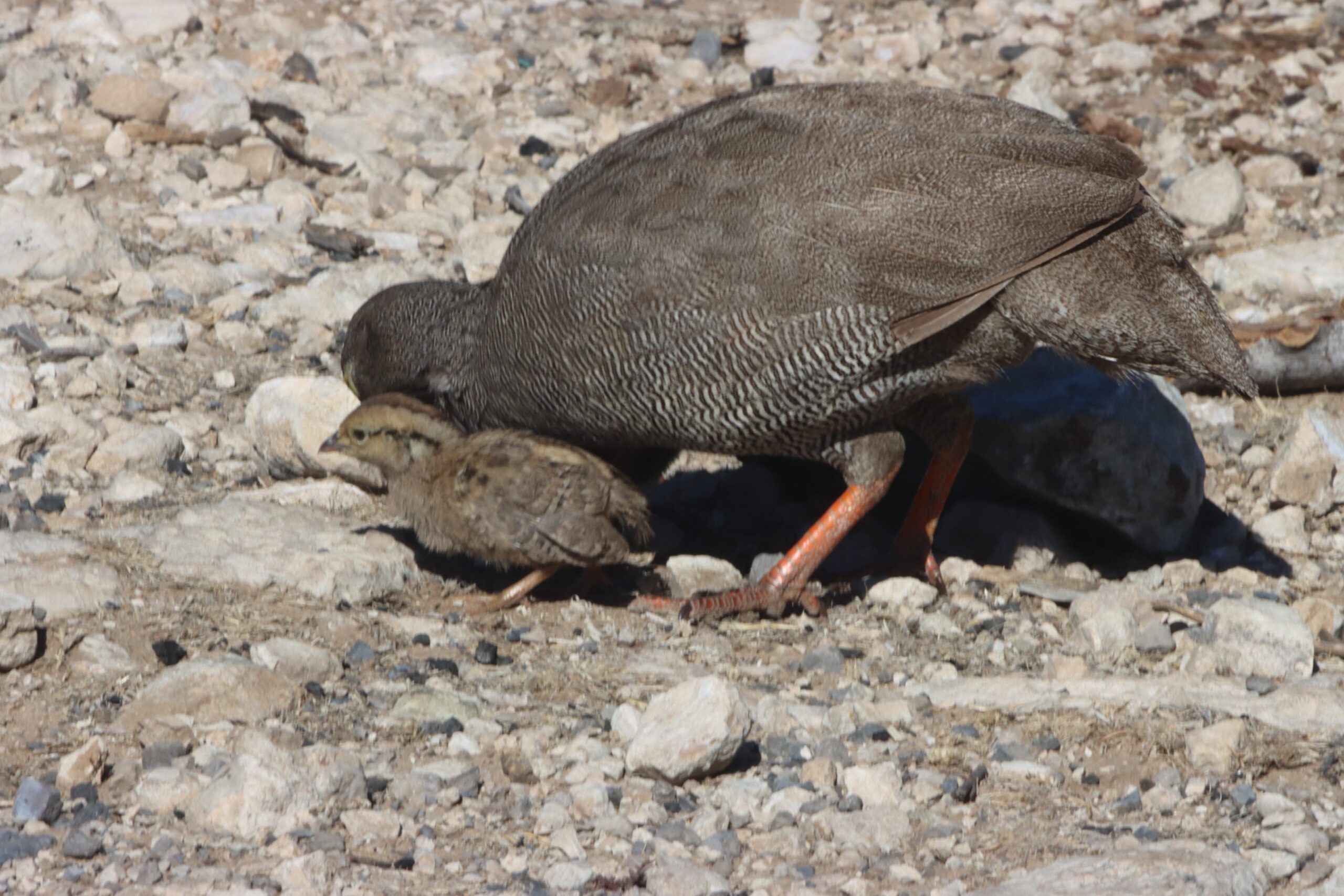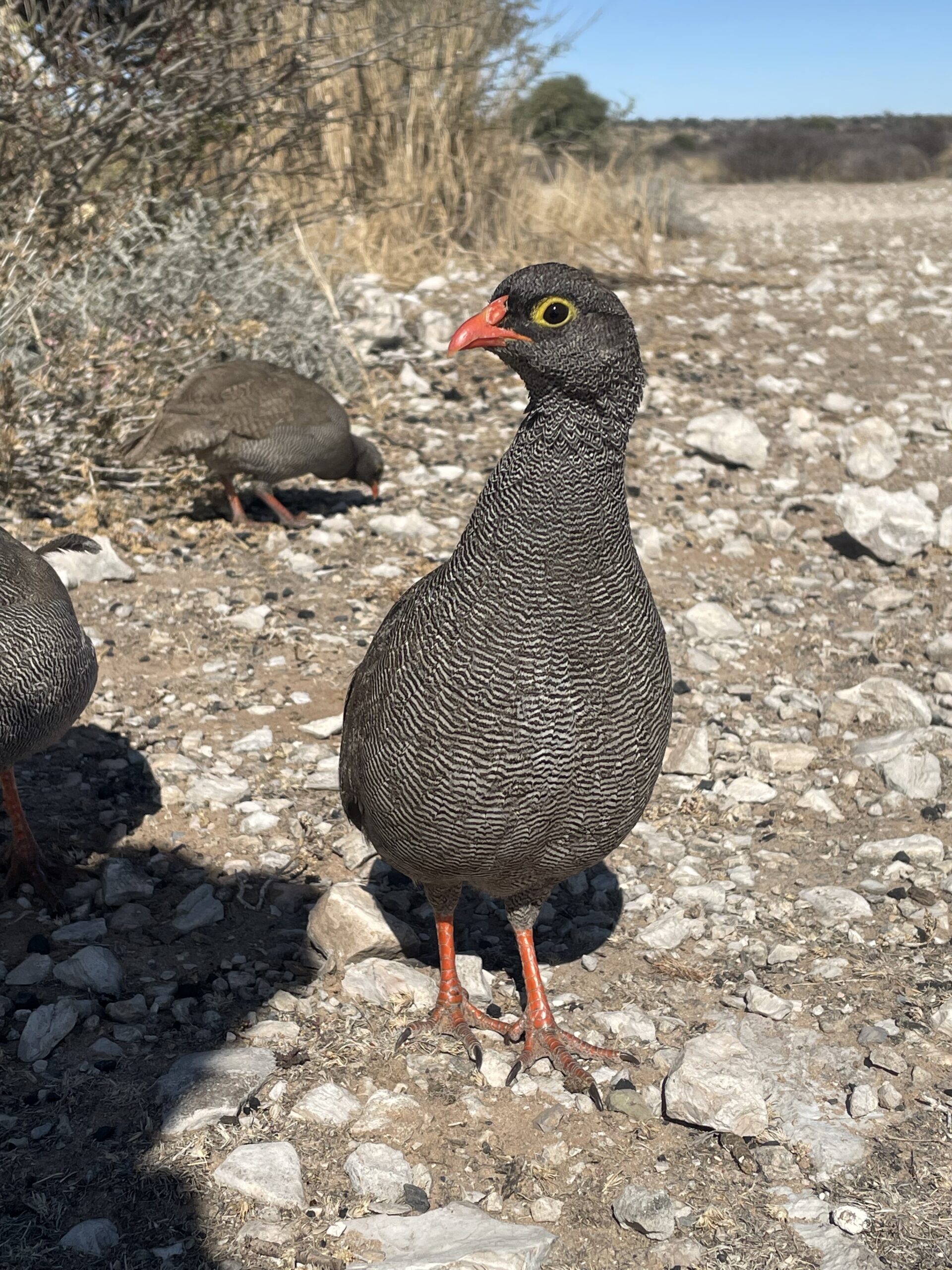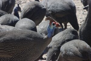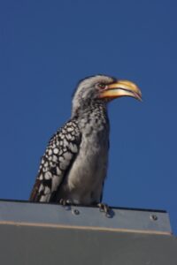 Wie auf fast allen Campsites wechseln sich verschiedene Vogelgruppen auf der Suche nach Körnern, Krümeln und sonstigen Happen ab. Besonders die Frankolins (Hühner) und Tokos dürften hier einen Narren an unseren Muffins gefressen haben. Die brauchten nur das Rascheln des Papiers zu hören und schon umringen uns mindestens fünf von ihnen. Ein Frankolin-Hahn ersann sogar eine besonders schlaue Taktik, um bei mir zu betteln. Er bringt mir seine Küken-Schar und lässt die kleinen, nur rund 10 Zentimeter großen, fiependen Flaumknäuel über meine Füße laufen und schaut mich mit diesem erwartungsfrohen Blick an, als würde er sagen: „Schau, ich hab´ doch eine Familie zu versorgen!“ Es ist einfach entzückend, was man mit den Tieren hier draußen alles erlebt. Und natürlich hat seine Strategie Erfolg!