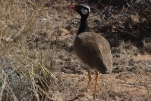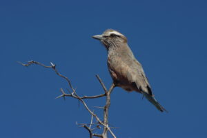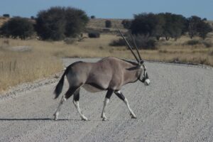 Wir verabschieden uns von Marie und Patrick, die beiden haben Pläne für die Weiterfahrt außerhalb des Parks. Wir bleiben noch im Park und beginnen unsere Runde zum nächsten Campsite über die Khiding Pan im Nordwesten. Das dortige Wasserloch schillert rostig rot, weiße Salzkristalle haben sich an den Rändern gebildet. Das Wasser plätschert in den kleinen Pool aus einem ebenfalls von Salz verkrusteten Rohr. Der Test am Auslass bestätigt die Vermutung, für die Tiere ist diese Tränke keine Option. So sehen wir auch hier vorwiegend schöne Vögel, wie die Gabelrake und ein paar Oryx, die recht lange ohne Süßwasser auskommen.