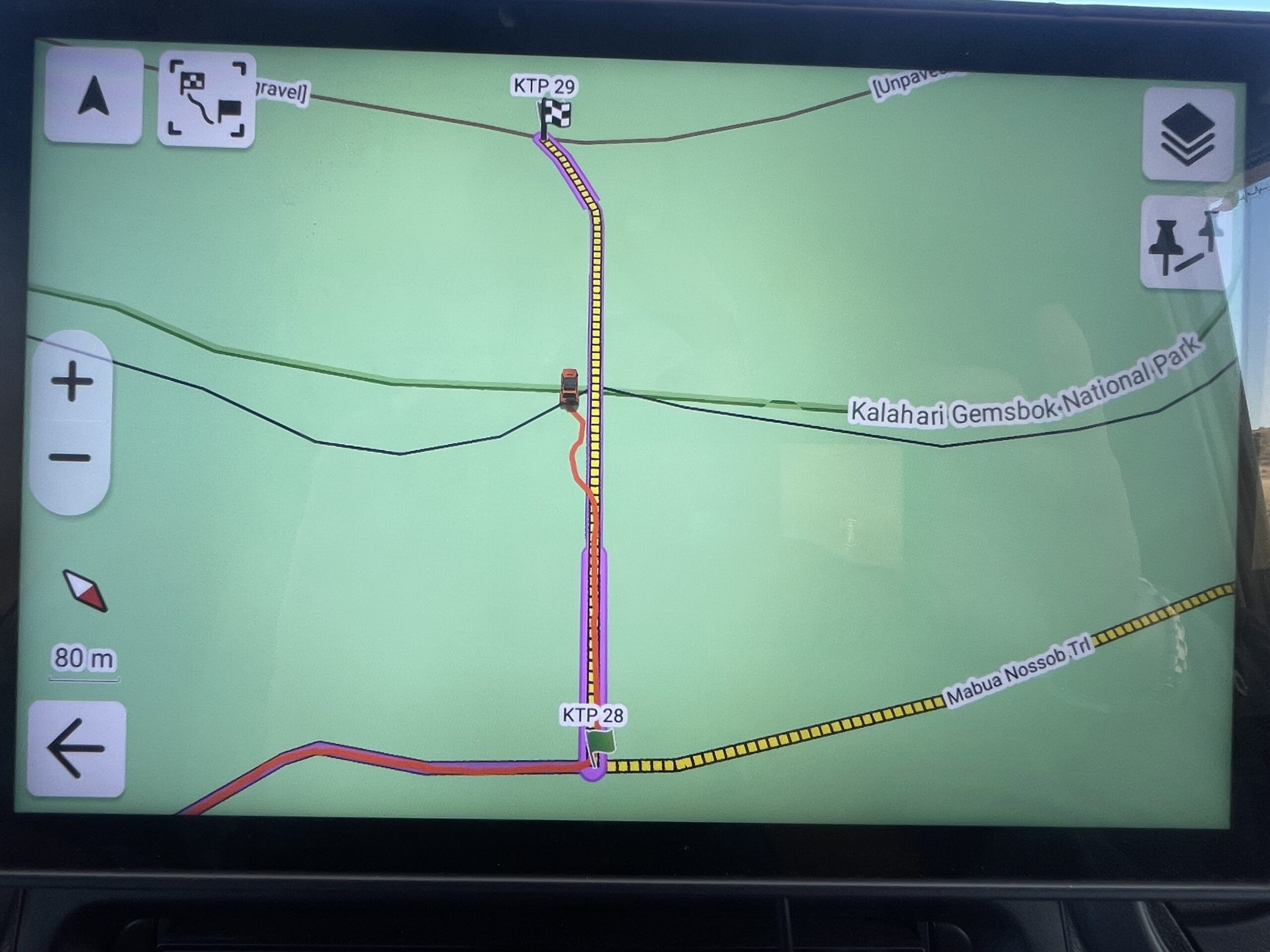 Gestärkt und munter packen wir die letzten 25 Kilometer der „Waschrumpelpiste“, die es uns zum Ende hin nochmals so richtig zeigt. All unsere durchgeklopften Muskeln jubeln voller Erleichterung und Hoffnung, als wir endlich bei der T-Kreuzung auf die parallel zur Parkgrenze verlaufenden Piste stoßen – ein baldiges Ende dieser zwar streckenmäßig kurzen, aber zeitlich langen Etappe ist in Reichweite.