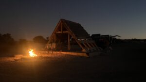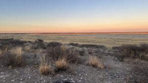 Der zugeteilte Campsite heißt „Lefika“ und ist schnell gefunden, er liegt direkt am Rand der großen Pfanne mit gutem Rundumblick. Einrichtungen hat er genau gar keine, wir sehen nur die von den vorhergehenden Campern angelegten Feuerstellen, von denen wir uns eine aussuchen, unsere Campingsessel dort platzieren und einmal mit einem Bier die Ankunft in der herrlichen Wildnis in Mabuasehube feiern.