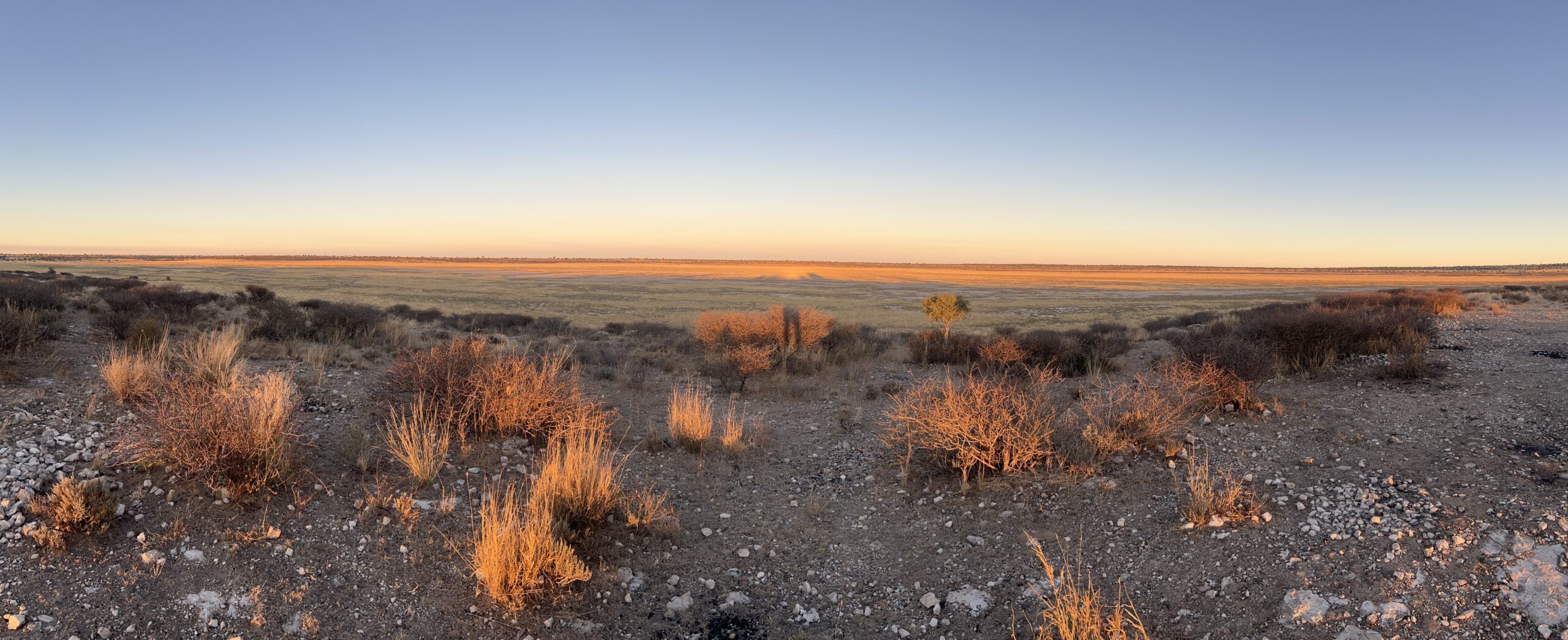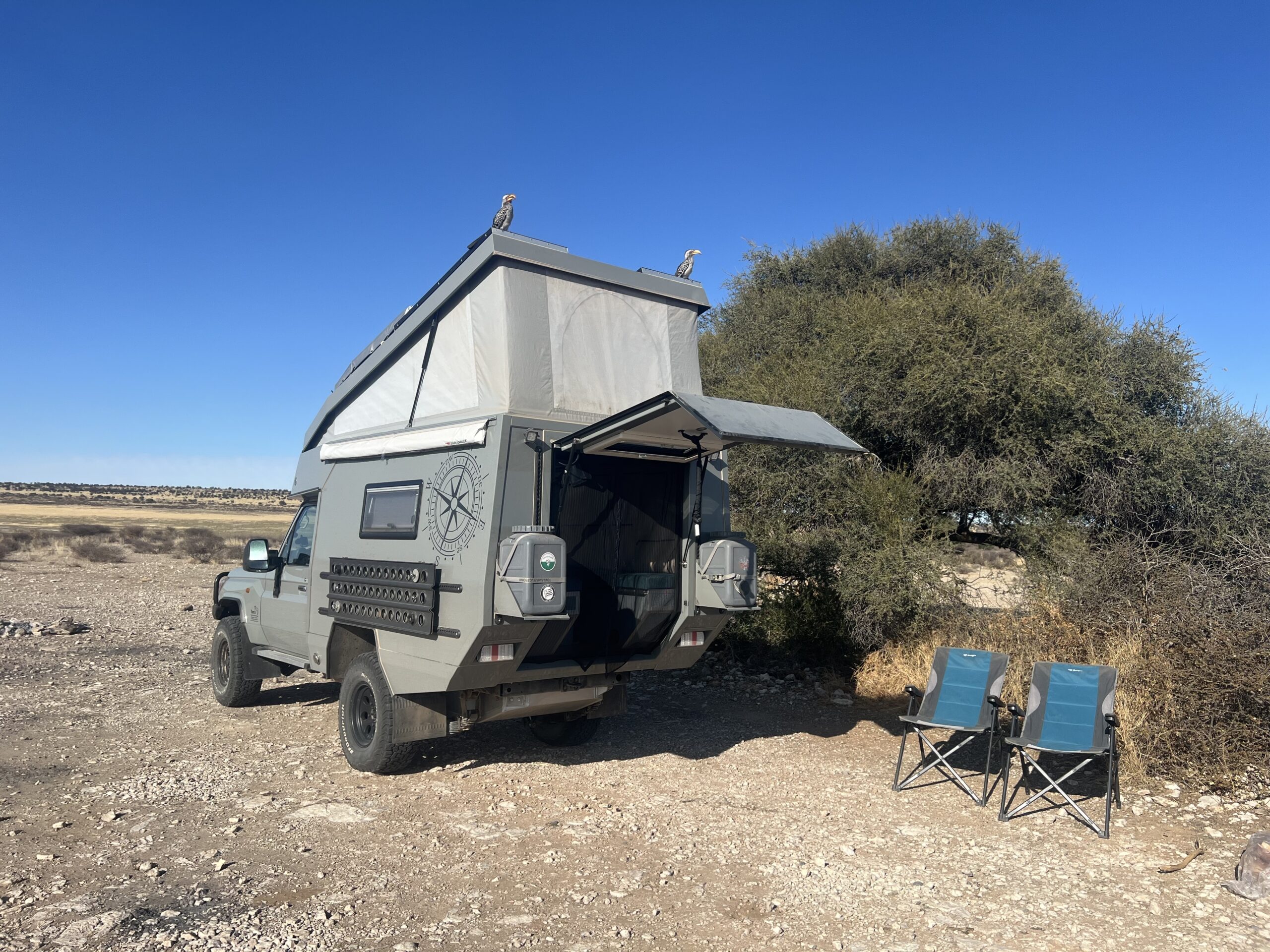 Die Gegend ist so einsam und verlassen, dass wir getrost nach rund 4 Stunden Fahrt mitten auf dem Weg halt machen und kurzerhand unsere tägliche Dusche nehmen. Nicht einmal ein Borstenhörnchen schaut uns dabei zu, obwohl wir links und rechts von uns zahlreiche Eingänge zu deren weitläufigen Bauen erspähen. Erfrischt und wieder bestens gelaunt braut Barista Martin noch einen guten Mokka mit der allseits geliebten Bialetti und reicht mir durch den Moskitovorhang die blauen Espressotassen, auf denen jeweils ein köstlich süßer Muffin schaukelt. „Café Kalahari“ taufe ich diesen Ort.