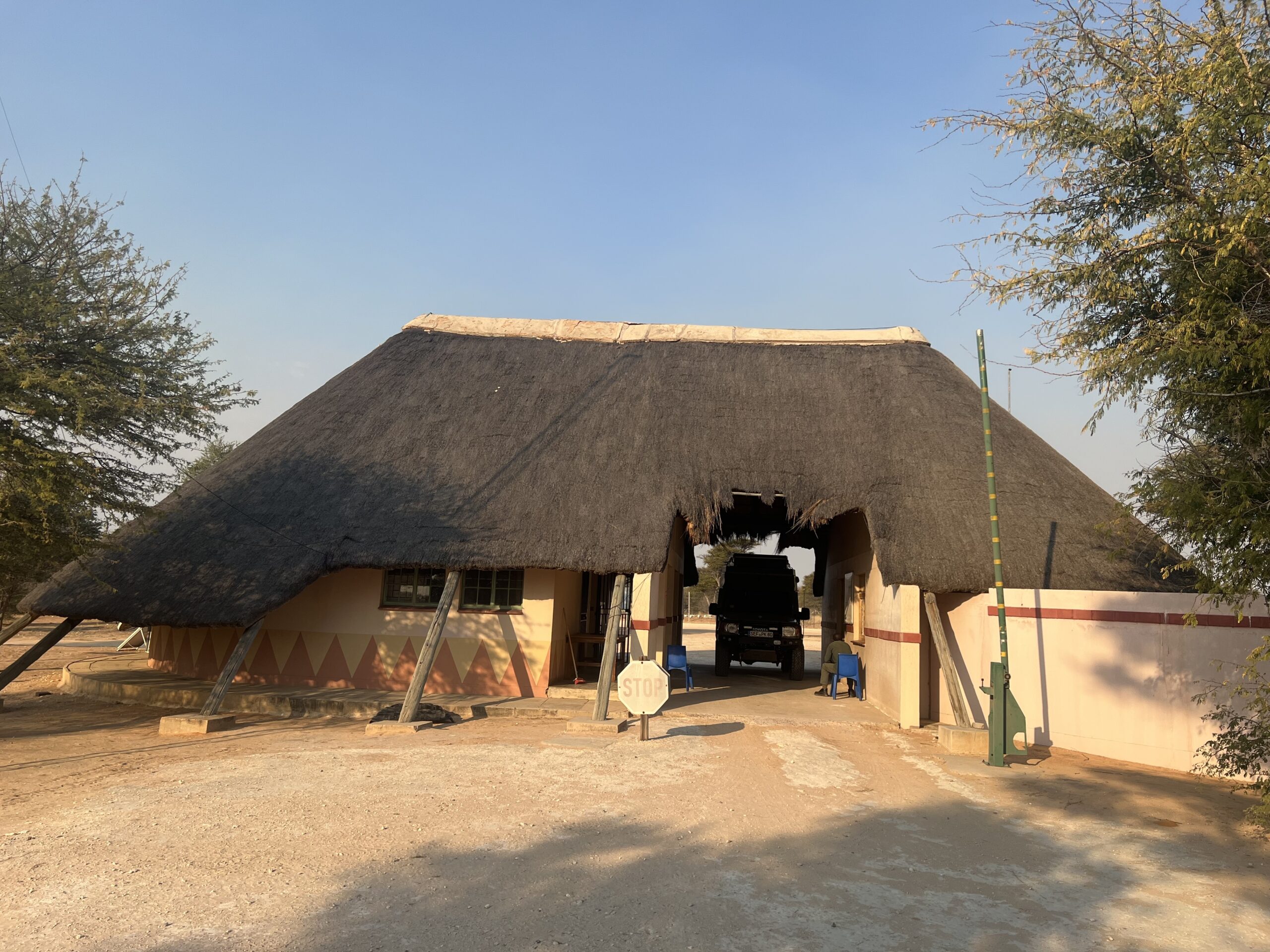 Am Gate geht das Einchecken flott. Da kein Park-Mitarbeiter vor Ort ist, regeln wir die Übernachtung in der ersten Nacht mit dem „Inter-Tourism“ Agenten, für die Folgenächte haben wir ja schon vorab gebucht. Die Parkfees sollen wir dann eben beim Verlassen des Parks in Twee Rivieren (Südafrika) bezahlen, dort gibt es ein Büro der botswanischen Parkbehörde.