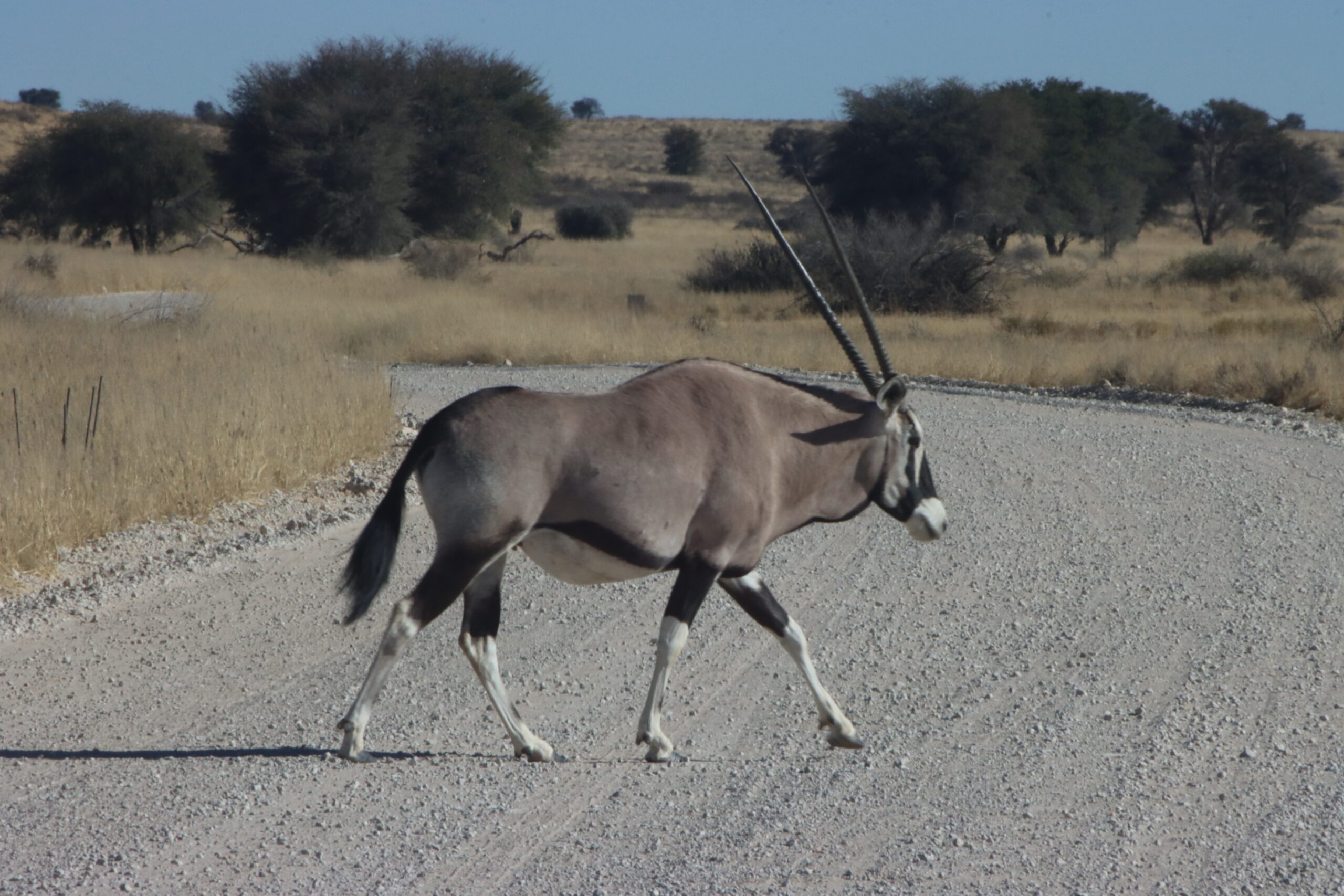 Die Abfahrt von der letzten großen Düne führt direkt durch das trockene Nossob-Flussbett nach Südafrika. Im Nossob-Restcamp halten wir nur kurz, um unser Permit für Südafrika zu holen. Wir haben nicht reserviert und müssen ohnehin bis Twee Rivieren fahren, um dort die Grenzformalitäten zu erledigen. Die Fahrt ist lang, und an den Wasserlöchern ist kaum was los. Wir sehen nur Springböcke, Oryx, Gnus und Strauße. Von den vielen Löwen, die es hier vor einigen Jahren fast an jeder Wasserstelle lagen, ist weit und breit nichts zu sehen. Leider gelangen wir dann auch zu spät an den Grenzposten, der schon um 16:00 schließt, weshalb wir auch nicht in Südafrika stehen dürfen. Kurz vor 18:00 helfen uns die botswanischen Nationalpark-Leute dann doch noch, und wir bekommen einen Platz in Rooiputs auf einem Hügel auf der botswanischen Uferseite des Nossob-Tals rund 25 km entfernt. Es ist wie gewohnt ohne Zaun, womit wir noch einmal Wildnis-Feeling genießen dürfen. Die Südafrikaner lieben es, ihre Camps mit hohen Zäunen zu umgeben, damit kein Tier über Mangusten-Größe die Camper belästigt. Warn-und Verbotsschilder warnen vor allen möglichen Gefahren. Irgendwie vertraut man in Botswana mehr auf den natürlichen Überlebenstrieb der Besucher. Da wir diesen Trieb auch haben, genießen wir die neunte Buschnacht in Folge, lediglich „bedroht“ durch einen Schakal, eine Giant Eagle Owl und einen Springhasen („African Roo“).