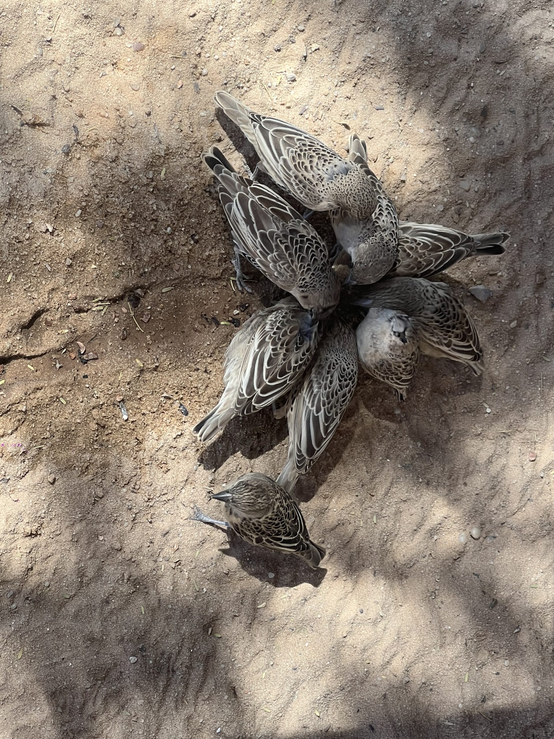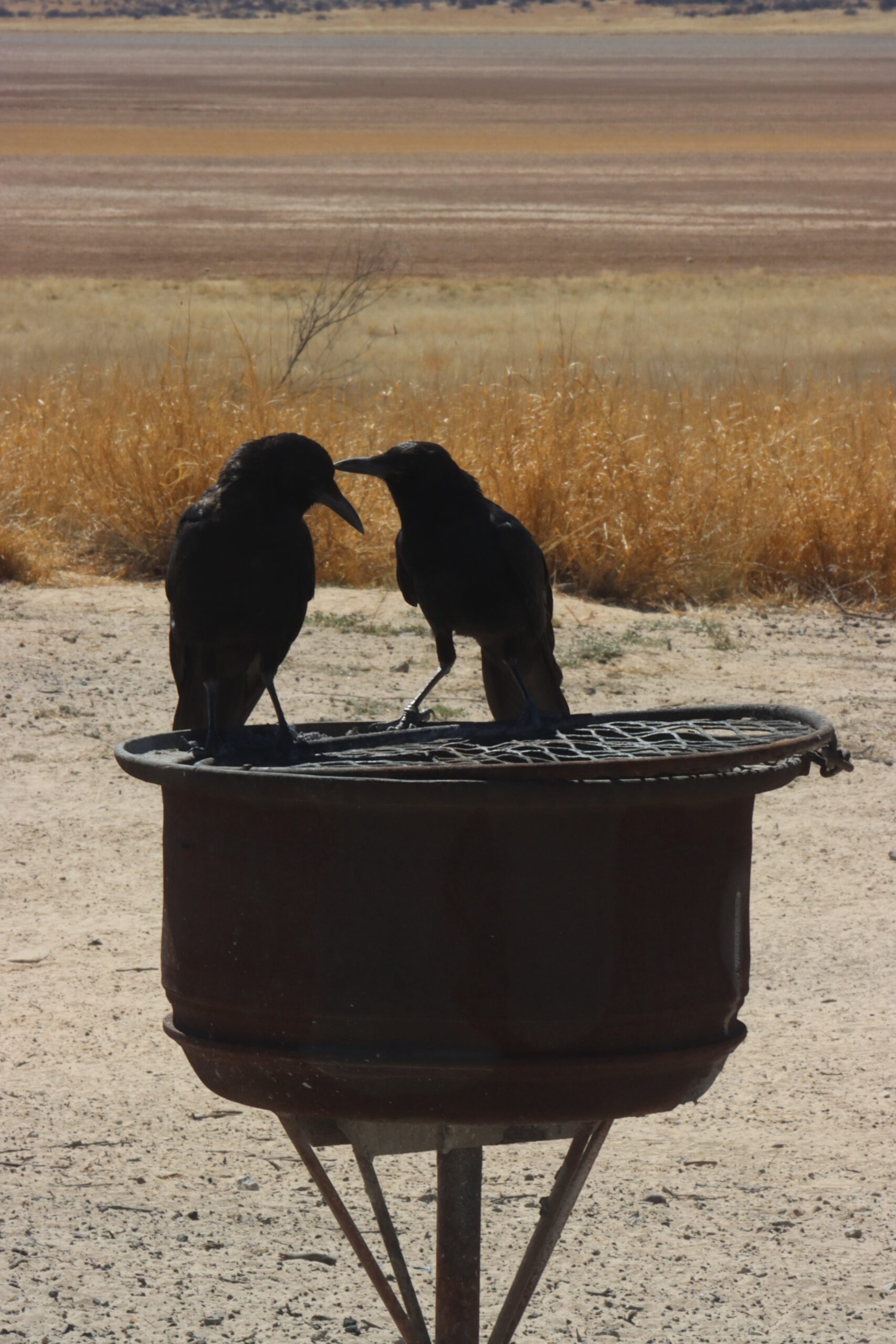 Die Mabuasehube Pan begeistert uns sofort wieder mit ihrem umwerfenden Panorama. Es wirkt wie eines dieser aus verschiedenfarbigem Sand gefertigten Bilder, die oft in Souvenirläden feilgeboten werden. Nur diesmal ist die Künstlerin die Natur selbst, die Schichten aus braunen, gelben, mint- und sogar leicht rosa-farbenen Tönen malt. Verträumt schauen wir hinaus über die Pfanne, auf der eine Springbockherde weit verteilt grast. Der Campsite mit dem hölzernen V-förmigen Schattendach über der Betonplattform ist uns vertraut, hier waren wir schon mal. Erneut dauert es nicht lange, und die unterschiedlichsten Vogelarten besuchen uns. Schwarze Krähen, Tokos, Glanzstare, Tauben, Perlhühner und verschiedene bunte Kleinvögel wechseln sich ab an der kleinen Tränke, die Camper vor uns fürsorglich aus einem PET-Kanister gebastelt haben. Rund um uns piepst, zwitschert und gackert es ohne Unterlass.