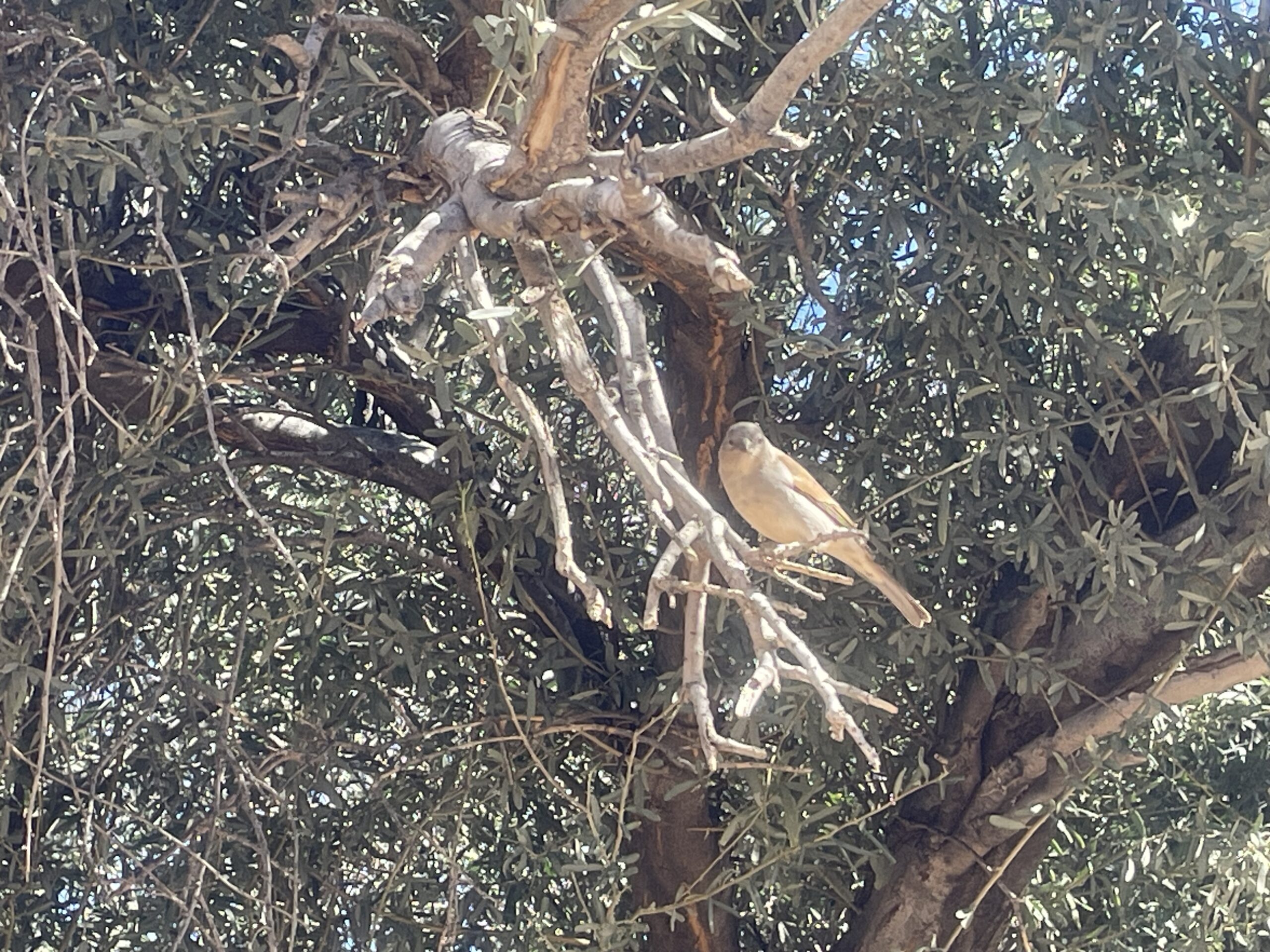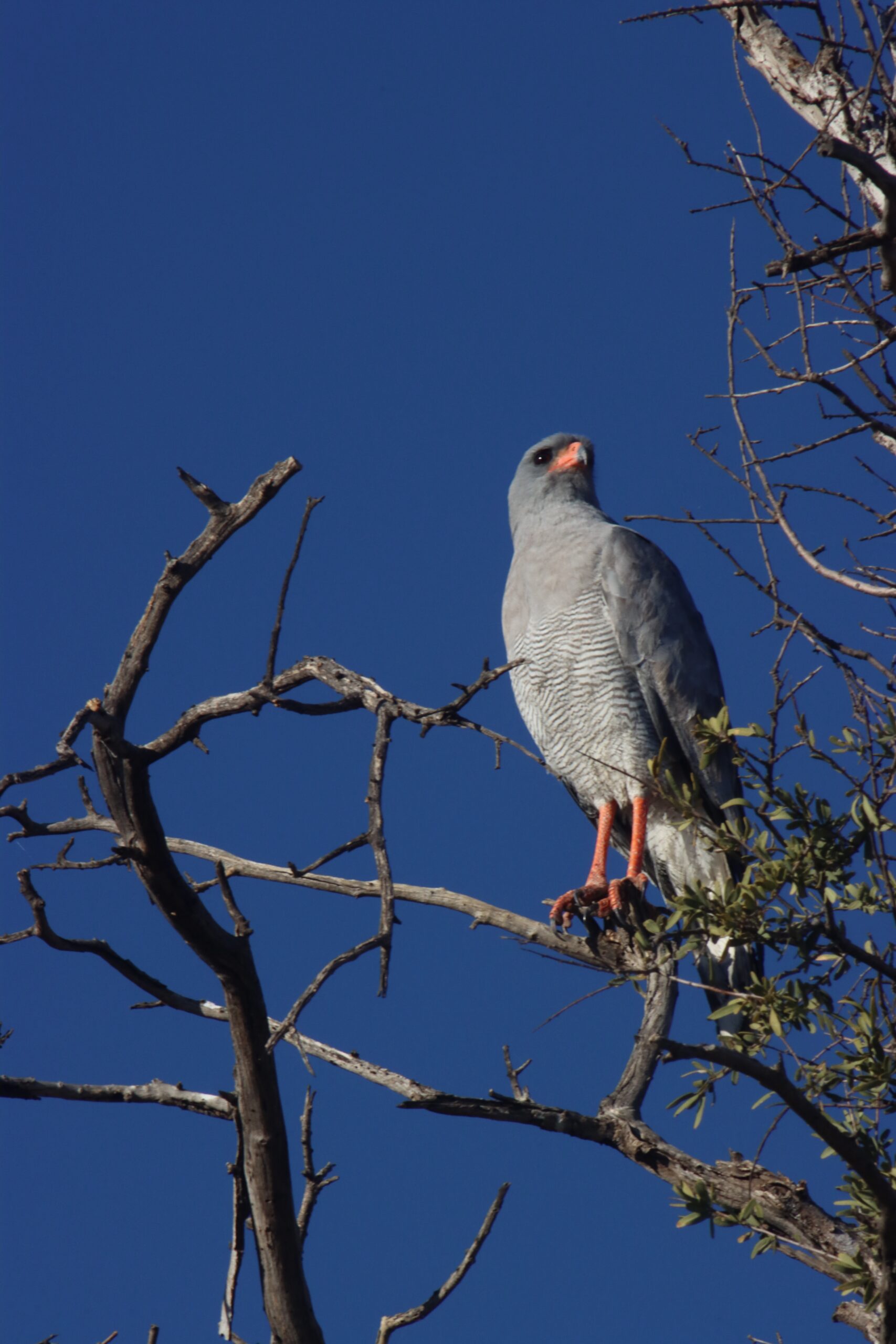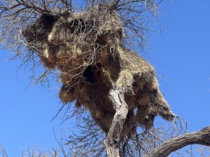 Die Strecke aus überwiegend rotem Sand ist gut befahrbar, nur hin und wieder müssen wir Luna vorsichtig über ein paar Steinpassagen bringen. Zahlreiche Blitzschlagopfer stehen in der Landschaft. Diese Bäume sind der verkohlte Beweis für die heftigen Gewitterstürme, die hier in der Regenzeit über die Wüste fegen. Es mehren sich die Webervogelnester. Manche Arten errichten als Kolonie riesige Bauten aus Halmen, welche die Äste hoher Bäume manchmal gänzlich umhüllen. Die Eingänge sind – vom Regen geschützt – jeweils an der Unterseite. Im Unterschied zu diesen Sozialbauten bevorzugen andere wiederrum mehr Privatsphäre und weben ein kunstvolles, an langen, dünnen Ästen herabbaumelndes Einfamilien-Nest.
