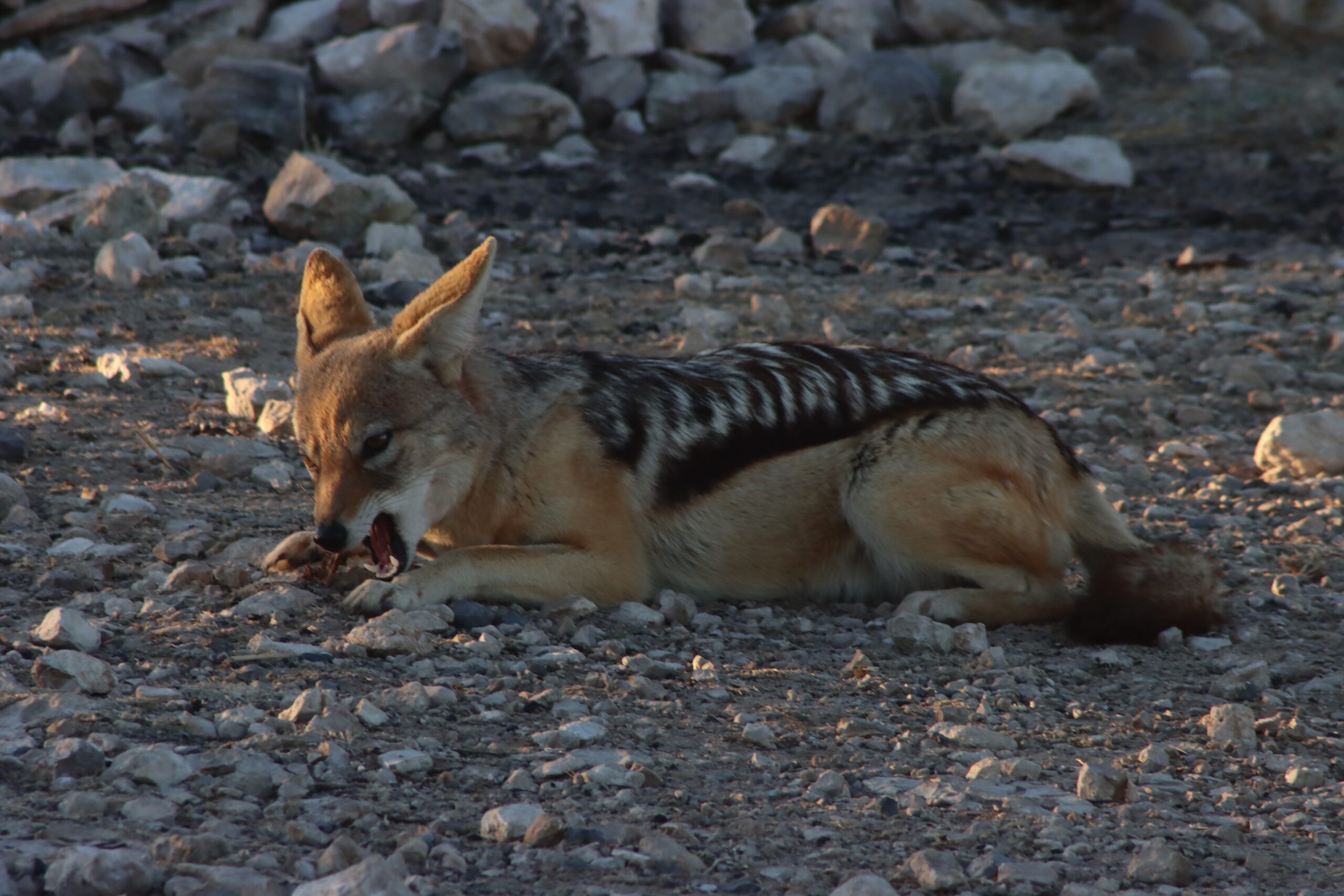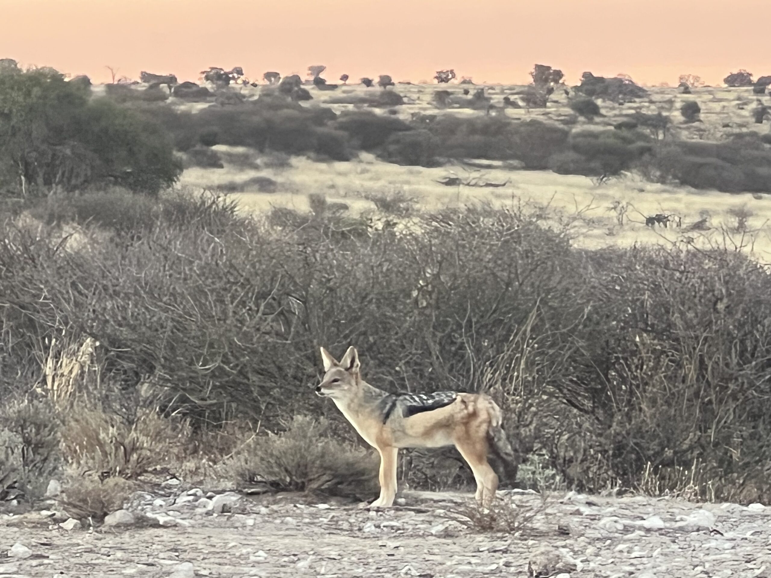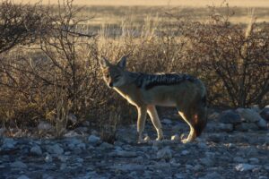 Es dauert nicht lange, bis wir Besuch bekommen. Ein neugieriger Schakal schleicht durchs Gebüsch und schlendert dann seelenruhig nur rund 20 Meter entfernt über den Platz.