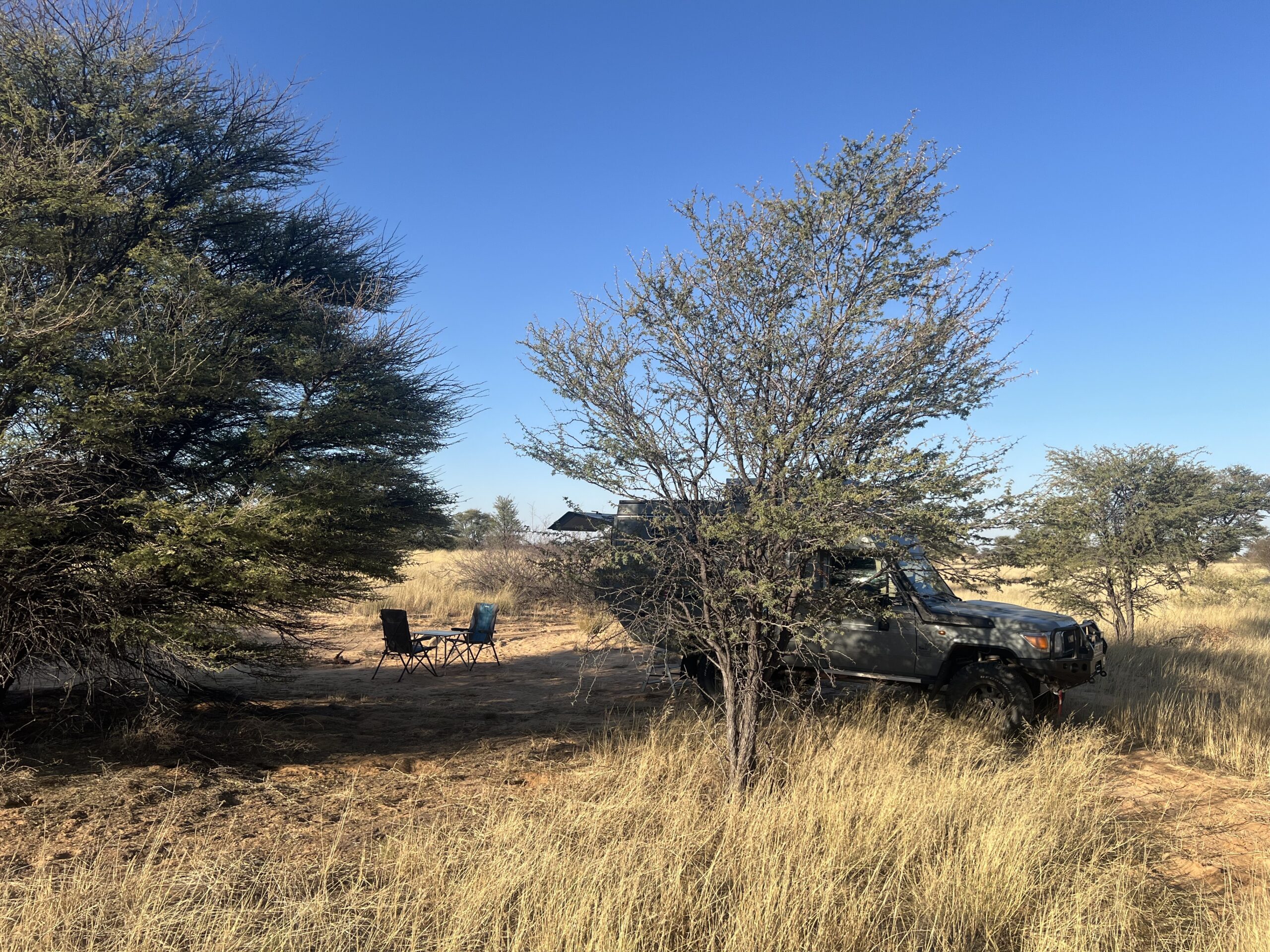 Zwei weitere nette Überraschungen bringt dieser Morgen. Wir denken fast, dass wir in einen Spiegel schauen, als ein Worldcruiser, beinahe baugleich mit Luna, die Einfahrt zu unserem Site nimmt. Da wir aber noch nicht draußen sind, verzieht sich das andere Vehikel diskret wieder. Nicht lange danach biegen die langreisenden Franzosen mit ihrem „Armadillo“ (Defender), die wir schon in der Central Kalahari getroffen hatten, auf unseren Campsite ein. Wir tratschen ein bisschen mit den beiden und erfahren, dass zwei Löwinnen den Campsite neben uns belagert haben und die dortigen Camper den Aufenthalt – verschanzt in der Klohütte – unfreiwillig verlängern mussten. Bei uns hätte es keine Klohütte gegeben – Löwengebrüll verleiht dann eben Flügel!