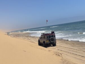 Gut gestärkt steigen wir in die bereitstehenden Defender, ich natürlich gleich auf den Beifahrersitz, denn ich würde gerne das „Driver-Feeling“ haben, auch wenn ich nicht am Steuer sitze. Man könnte zwar selbst in die Dünen fahren, aber für die großen Sandhaufen wäre Luna wohl zu schwer, außerdem gibt es mehrere Passagen am Meer entlang, bei denen man die Tide genau im Blick haben sollte. Das eine oder andere Auto hat es hier schon mal nicht herausgeschafft, bevor die Flut kam. Der Beifahrersitz in einem fremden Auto bringt somit wesentlich mehr Entspannung!
