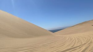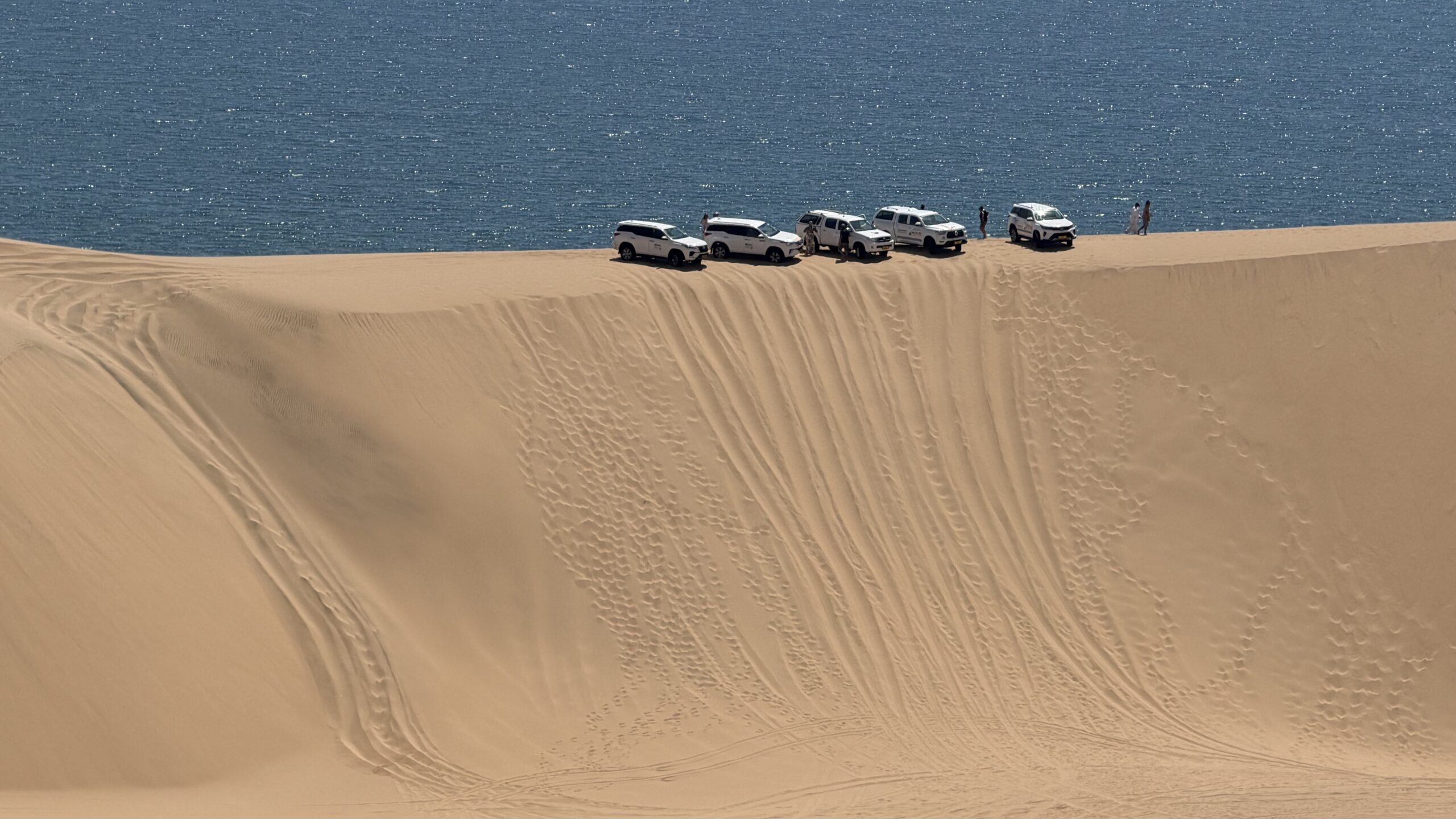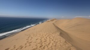 Neben der „driving experience“ fasziniert uns aber auch die großartige Landschaft. Riesige, goldene Dünenberge stürzen in den blauen Atlantik. Ein mitreißender Farbkontrast, den wir auf den zahlreichen Stopps auf Dünenkämmen immer wieder bestaunen (und mit Champagner begießen) dürfen. Was für ein Jahresausklang!
