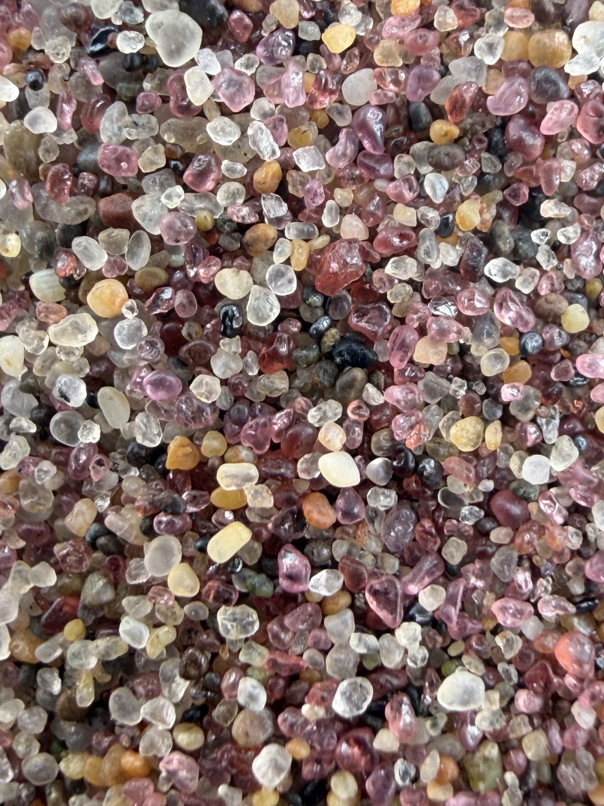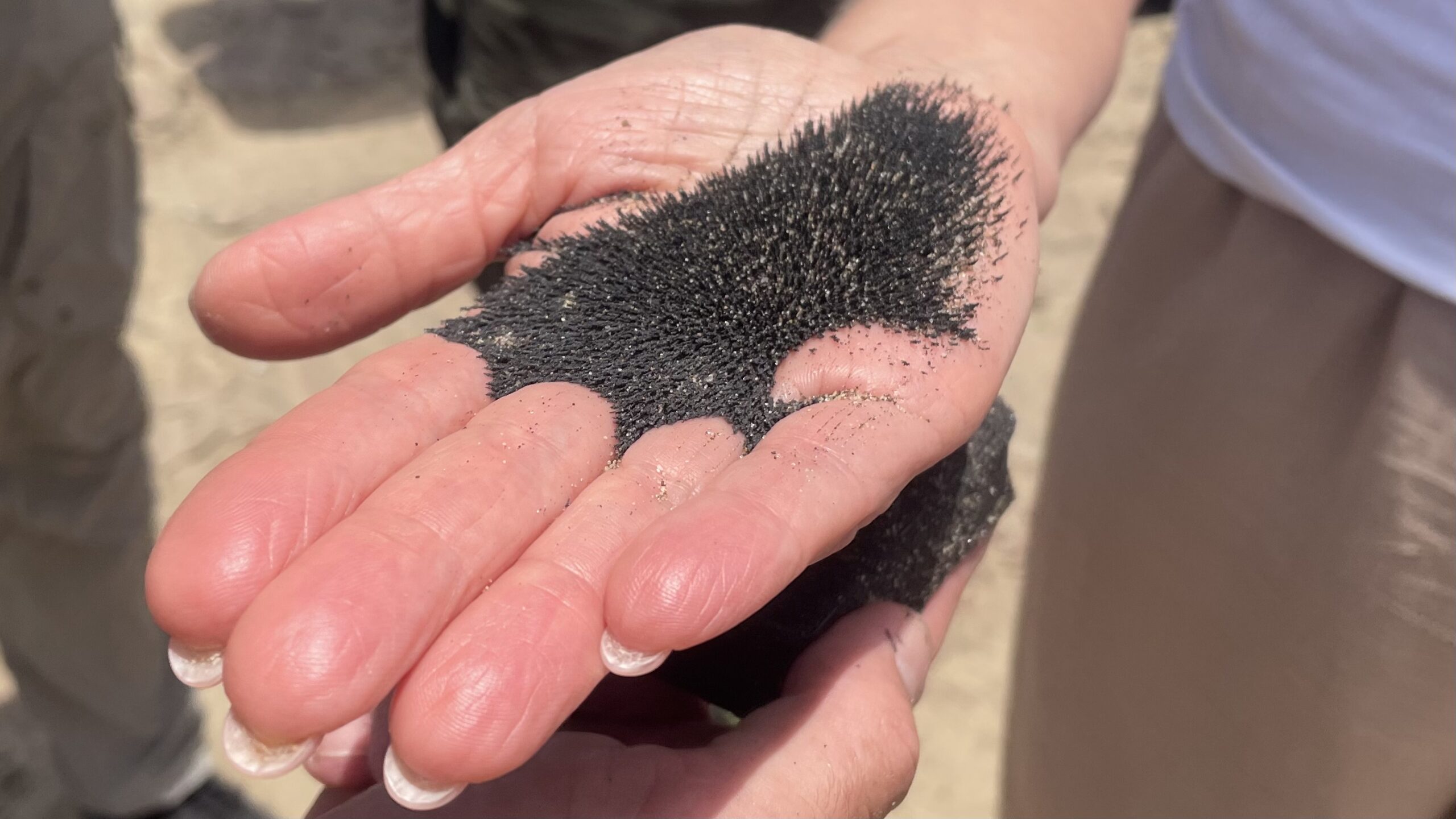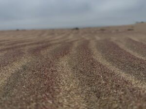 Wir genießen die Fahrt, brettern zuerst die Küste entlang, vorbei an vielen Kabeljau-Fischern, durch ein Trockenfluss-Tal mit der letzten grünen Vegetation auf kleinen Sandhaufen hin zu den Dünen, die sich südlich von Walvis Bay auftürmen. Bei Stopps am Meer erklärt unser Fahrer die Zusammensetzung des Sandes am Strand. Die teilweise dunkleren Farben in den kleinen Sandwellen kommen von eisenhaltigem Gestein, das vom Meer zermahlen wurde, die rosa Farbe vor allem von rotem Granat. Die schwarzen Sandkörner lassen sich tatsächlich mit einem Magneten leicht isolieren, die Sandpartikel auf Evas Hand richten sich nach dem Magneten aus, der unter ihrer Hand bewegt wird. Bei Aufnahmen mit dem Makro-Objektiv des iPhones erkennen wir die verschiedenen Bestandteile des Sandes – er schaut stark vergrößert Betrachtung aus wie eine Ansammlung von Halbedelsteinen!