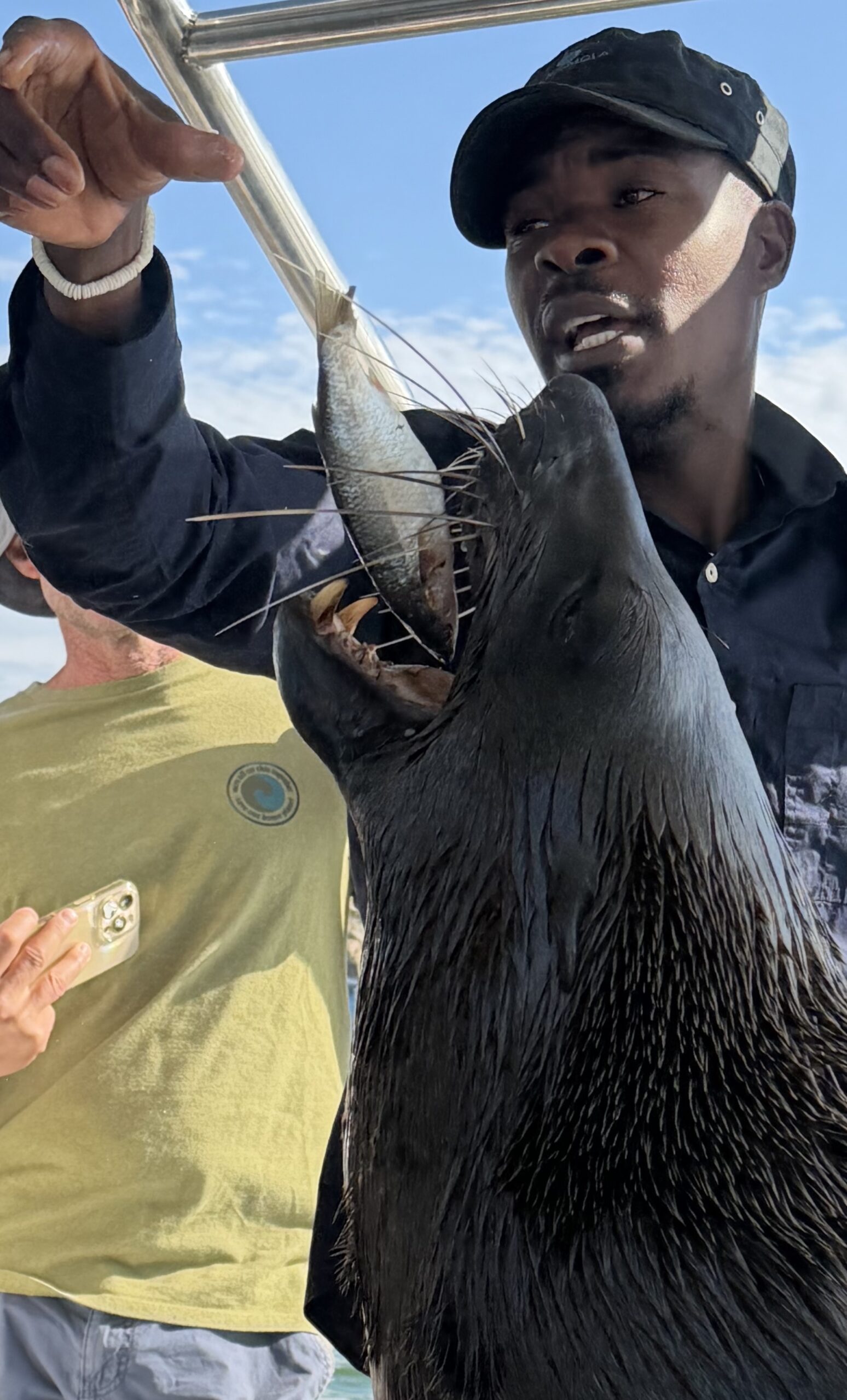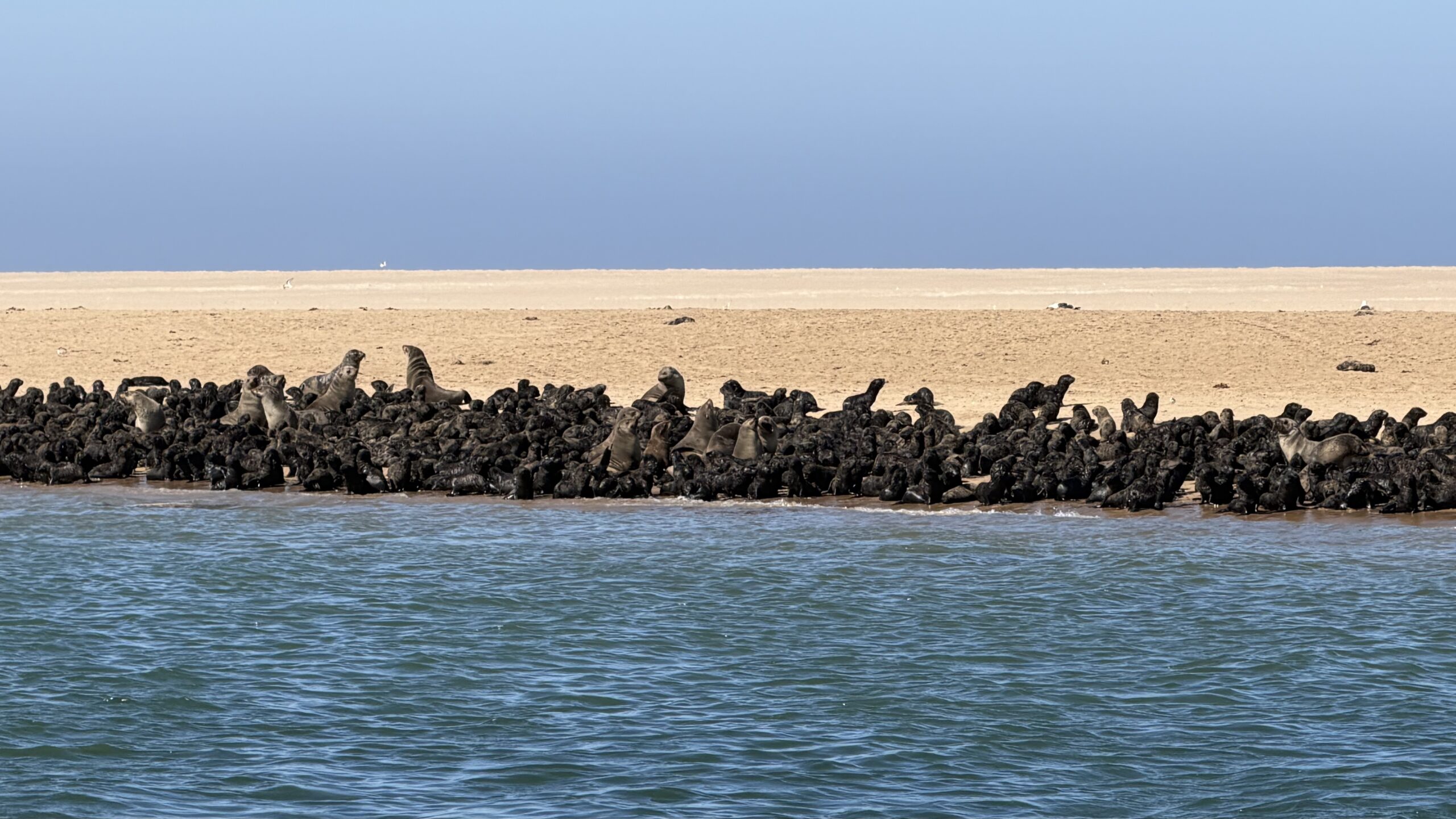 Schon lange freue ich mich darauf, den letzten Tag des Jahres 2025 in den Dünen zu verbringen. Wir haben – ganz touristisch – eine Ganztages-Tour gebucht, deren Höhepunkt ein Ritt im Geländewagen durch die bis zu 100 Meter hohen Dünen ist. Aber zuerst geht es per Boot hinaus zum Pelican Point, einer Halbinsel vor Walvis Bay. Von unserem Captain angekündigt wuchtet sich schon im Hafenbecken eine der hier allgegenwärtigen Zwergpelz-Robben namens Junior auf unser Boot und lässt sich das dargebotene Heringsfrühstück schmecken. Nur wenig später landet ein riesiger Pelikan am Dach des Bootes und erfreut sich ebenfalls an dem einen oder anderen Fisch, die er kunstvoll aus der Luft fängt. Man sieht richtig, wie der Happen zunächst im Kehlsack zurechtgeschüttelt wird und dann zur Gänze in den langen Hals wandert. An zahlreichen Robben-Kolonien vorbei erreichen wir Pelican Point, wo wir mit Blick auf den alten Leuchtturm einem ausgezeichneten Mittagessen verwöhnt werden. Austern und südafrikanischen Sekt als Starter, danach klassisches Surf & Turf – Langusten und Steak am Grill frisch zubereitet. Ein aromatischer Mokka aus der French Press rundet das Strandbarbecue ab. Die dazu gereichten Brownie-Minis munden mir besonders (ich schnappe mir gleich drei Stückchen davon).