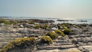 Von den Blumenwiesen in Namaqua fahren wir die Richtersveld-Route hinunter zur Küste in das kleine Hafen- und Ferienstädtchen Port Nolloth. Zu unserer Überraschung sind die Unterkünfte hier gut gebucht und erst nach ein paar Anläufen finden wir ein nettes Ein-Zimmer Beachhouse , das aber nicht – wie der Name vermuten ließe – am Strand gelegen ist, sondern erst in der dritten Reihe. Für eine Nacht passt das Mini-Appartement aber sehr gut als Ausgangspunkt für einen Spaziergang am von abgeschliffenen Felsenformationen und Massen an Muscheln geprägten Strand. Dazwischen tauchen hin und wieder kleine, flache Sand- und Kieselbuchten auf, in denen das Wasser gar nicht mal so kalt fürs Baden wäre. Die glatte Oberfläche des klaren Salzwassers schimmert verlockend. Doch draußen, jenseits der Felsen tobt eine heftige Brandung. Wir hören das Tosen der Wellen, deren weiße Kämme an der Riffkante brechen.