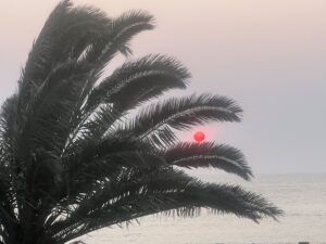Wie zerfetzte braune Gartenschläuche liegen immer mal wieder die abgerissenen Stängel und Blattteile des Kelp zwischen den Muscheln. Hier muss es tiefe Wälder davon geben. Das Bild von darin geschickt herumtollenden Robben taucht unweigerlich in unseren Gedanken auf. Vom Schwimmen ist hier eher abzuraten, denn Robben stehen ganz oben am Speiseplan zahlreicher hier heimischer Hai-Arten. Der beliebte Zeitvertreib der Südafrikaner dreht sich hier mehr um die Großfischjagd. So manch ein Pickup hat auf der Ladefläche eine große Spule zum Einholen der Fangleinen montiert, die „Sport“-Fischerei mutiert hier wohl eher zum Kampf Fisch gegen Pick-up…. Auch das Käfigtauchen ist hier wegen der vielen Weißhaie eine beliebte Attraktion. In den Werbe-Broschüren wird gebeten, aus Rücksicht auf den nächsten Benutzer des Tauchanzugs auf eine Mahlzeit vor dem Abtauchen zu verzichten, denn spätestens beim Anblick des ersten Weißhais…… Wir können also „leider“ nicht auf Tuchfühlung mit dem Weißen Hai gehen, schließlich wollen wir heute ordentlich Fisch essen (feig!). Eine ganze Platte im Restaurant des Scotia Inn Hotels verzehren wir, während vor uns die große rote Sonne zwischen Palmblättern im Atlantik versinkt. Der Hai muss halt warten, bis wir kommen.