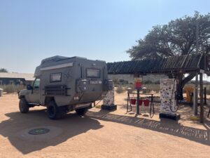 Das NWR-Camp am Canyon in Hobas ist nett und wir sind froh, zwei Nächte gebucht zu haben. So haben wir untertags genug Zeit, auch zu schwimmen (der kleine Pool ist wieder nur was für Eisschwimmer, also kein Delfin im Wasser…), zu lesen und ein bisschen zu dösen, zumindest bis zur Ankunft von zwei randvoll besetzten Overlander Trucks, die direkt gegenüber von uns unter lautem Geklimper von Zeltstangen, krachend vom Dach fliegenden Packsäcken sowie aufgeregtem Gekicher und vielsprachigem Geschnatter ihr Lager aufschlagen. Es stört uns nicht weiter, denn diese Tourgruppen fallen wie ein Schwarm Hornissen spät am Tag ein und sind üblicherweise frühmorgens auch wieder weg. Afrika in 14 Tagen….