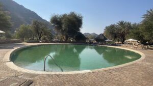 Ursprünglich gar nicht als Station auf unserer Tour eingeplant entpuppte sich der Aufenthalt im Ais-Ais Resort als sehr entspannend, nicht zuletzt wegen der heißen Quelle, die hier mit 65 Grad aus dem Boden sprudelt und zum „Abkühlen“ in ein riesiges ovales Becken gepumpt wird. Da geht sogar Martin ins Wasser und durchpflügt die Fluten wie ein Delphin. Das wohlig warme Wasser ist herrlich für die Muskeln.