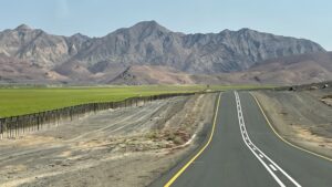 Am Morgen geht’s die Richtersveld-Route rund 80 Kilometer nach Norden bis Alexander Bay am Oranje. Die Landschaft wird zunehmend trockener und ist von Dünen geprägt, doch auch hier sehen wir immer wieder noch die leuchtend gelben, orangen und manchmal weißen Wildblumen, wenn auch nicht mehr so zahlreich. Eigentlich war unser Plan, hier über den Fluss wieder nach Namibia einzureisen und den Oranjemund (die Mündung) zu besuchen. Doch leider kann das Zolloffice in Alexander Bay das Carnet de Passage für Luna nicht ausstempeln. Somit bleibt uns nichts anderes übrig, als 10 Minuten nach unserer Ausreise aus Südafrika gleich wieder ins Land einzureisen. Die Grenzbeamtin nimmt es gelassen. Damit werden unsere Pässe mit zwei Stempeln mehr als erwartet geziert, und wir erfahren die weiten Ebenen der Richtersveld-Route nun eben auch in die Gegenrichtung. Ich gebe zu, ich bin ob der Eintönigkeit immer wieder mal eingenickt. Das so baldige Wiedersehen mit Port Nolloth will gefeiert sein, und außerdem ist es ja schon Mittag. Wir gönnen uns daher im von unserer Wirtin empfohlen und gut frequentierten Takeaway (das einzige im Ort) eine wohlschmeckende Portion Fish & Chips, die wir stilecht mit Blick aufs Meer verspeisen.