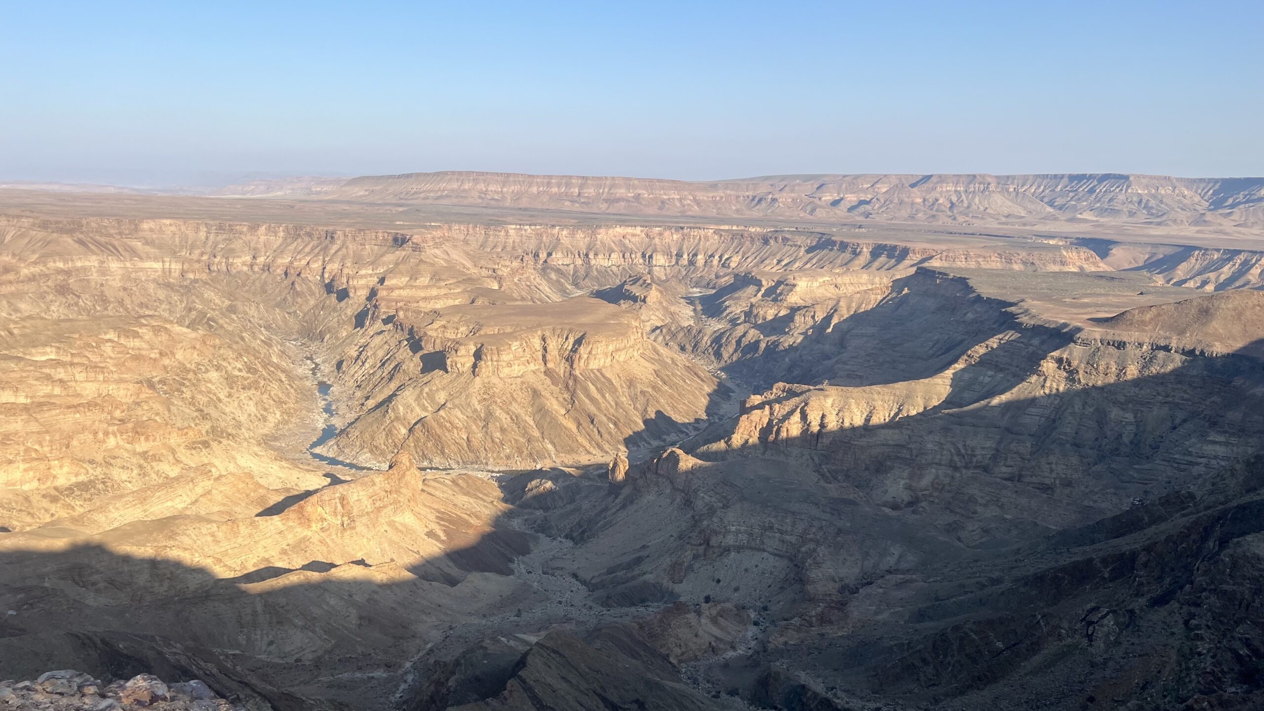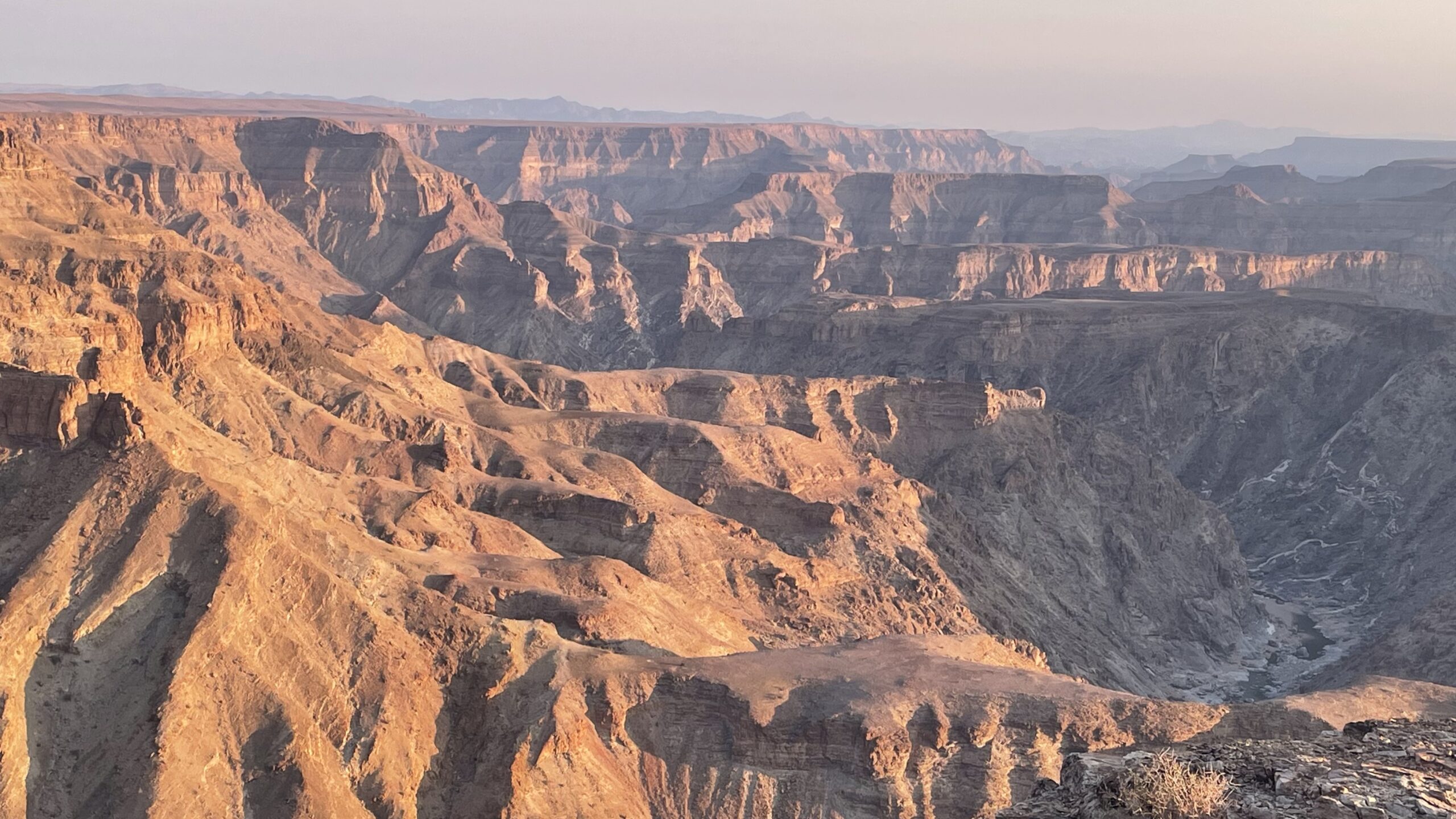 Die Infotafel am Main Viewpoint verraten uns, dass der Canyon Teil des Ais-Ais Richtersveld Transfrontier Parks ist, der 5.086 Quadratkilometer umfasst. Die Entstehung des Canyons erstreckte sich über Hunderte Millionen Jahren durch eine Kombination aus tektonischen Verwerfungen und starker Erosion durch den Fish River. Vor etwa 350 Millionen Jahren bildete sich durch die Bewegung der Erdkruste ein tiefer Graben, der als Ur-Tal für den Fluss diente. Gletscher vertieften diesen Graben während der Gondwana-Vereisung. Nach dem Auseinanderbrechen des Urkontinents Gondwana vor rund 120 Millionen Jahren hob sich der afrikanische Kontinent, was zu einer erhöhten Fließkraft des Fish Rivers führte und ihm ermöglichte, sich noch tiefer in das Gestein zu graben und die gewaltige Schlucht zu formen, die nun etwa 160 Kilometer lang, bis zu 27 Kilometer breit und bis zu 550 Meter tief ist und damit den zweitgrößten Canyon der Welt bildet.