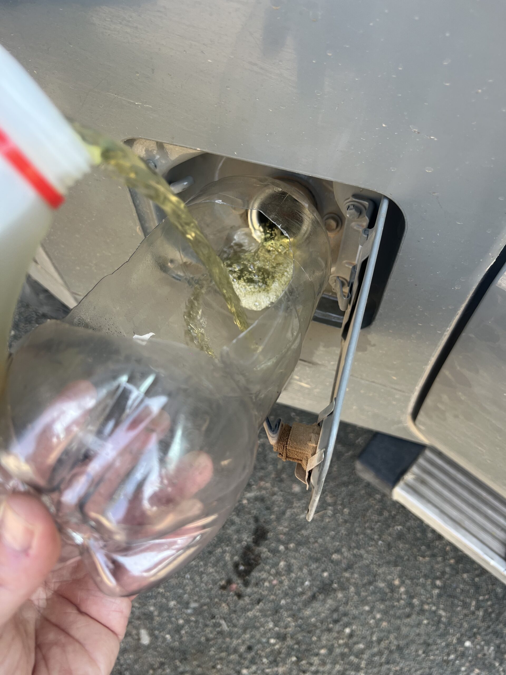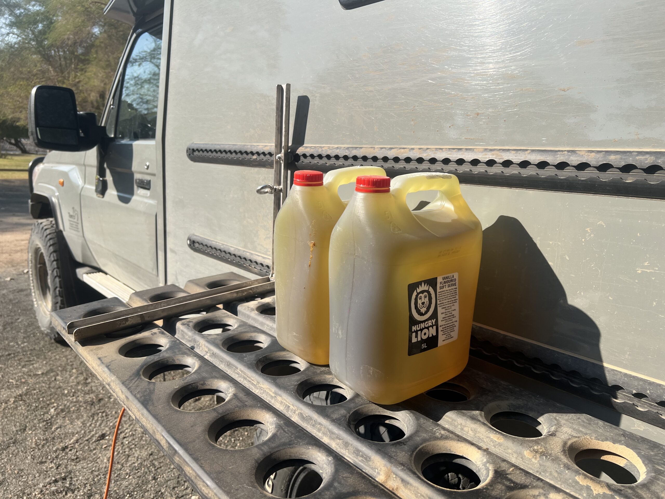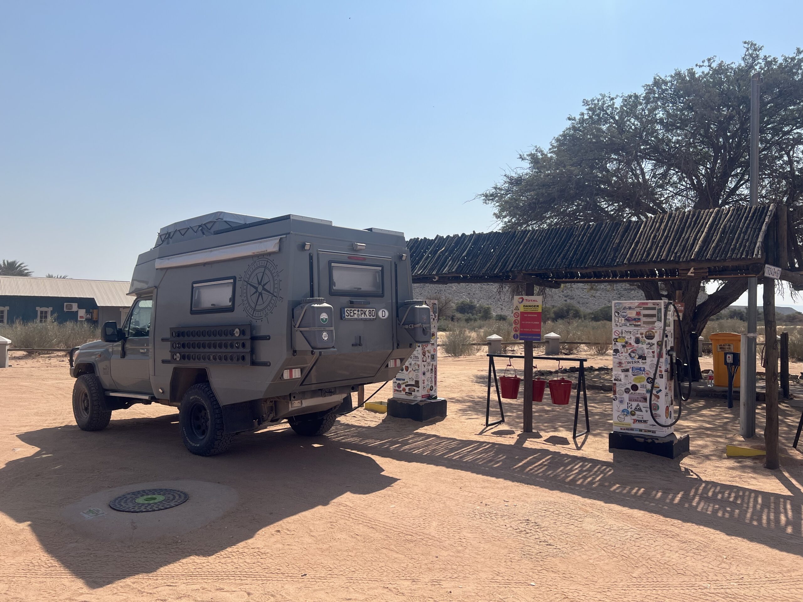 Am Ziel unserer Tagesetappe werden wir abermals enttäuscht. Das große NWR-Resort in Ais-Ais verfügt zwar über zwei Zapfsäulen, doch beide mit leblosem Display. Auch diese Tankstelle ist trocken, und wir haben nun nicht mehr genügend Benzin im Tank, um die knapp 100 Kilometer bis zur nächsten Zapfsäule zu schaffen. Aber – wie immer in Afrika – findet sich eine Lösung, hier in Person des  Rezeptionisten, der langsam und geduldig beginnt, verschiedene Kollegen zu konsultieren, im Resort und auch am Telefon. Am Ende schafft es das Team, vom mehrere hundert Kilometer entfernten Keetmannshoop noch am selben Abend zwei 5-Liter-Flaschen (deren früherer Inhalt laut Label ein „vanilla flavoured“ Drink im Hungry Lion war) mit Benzin zu uns zu karren. Selbst die schwierige Frage der Überweisung des erforderlichen Geldbetrages zum Erwerb des Treibstoffs wurde bravourös gelöst, indem der Koch und der Rezeptionist Teilbeträge per Telefon von ihren Konten auf das Konto des Fahrers schickten. Von uns gab’s dann Cash und ein ordentliches Trinkgeld. Gewinnmarge ohne Trinkgeld für das Rettungs-Team: 250%. Aber sie haben es sich redlich verdient.