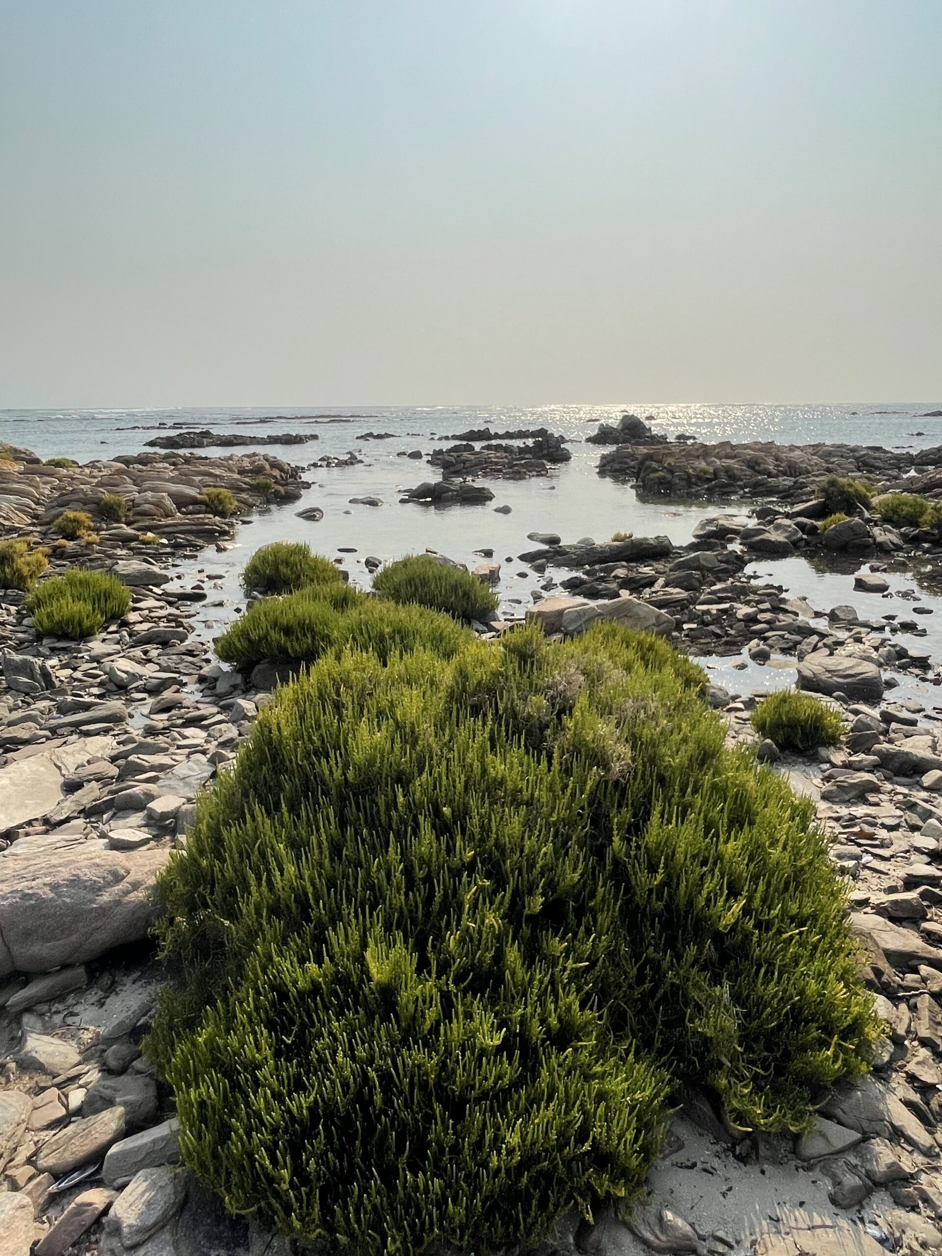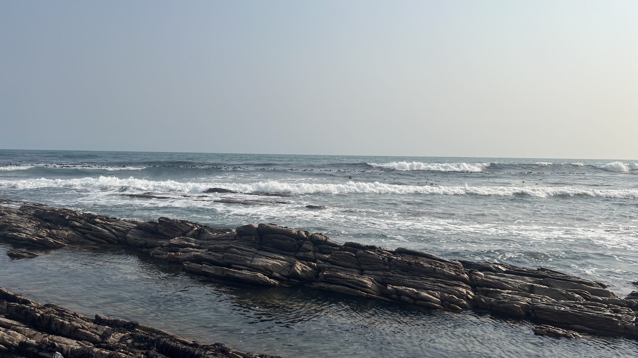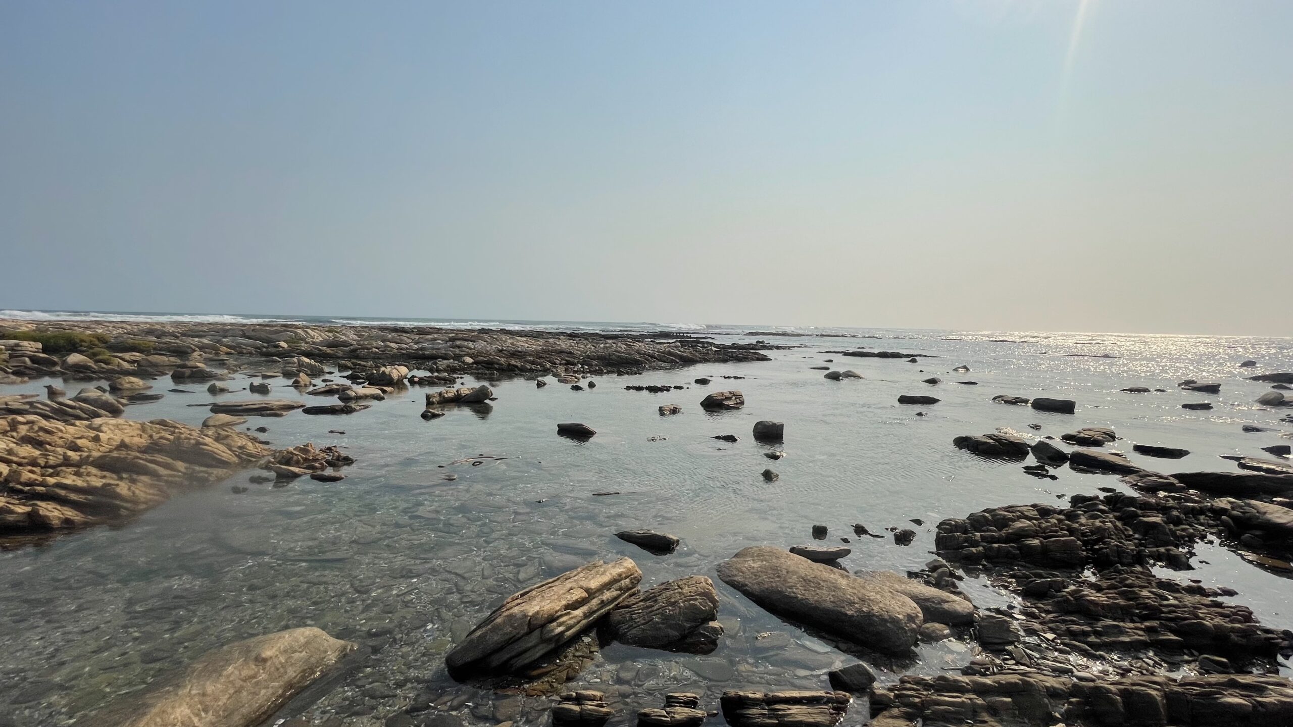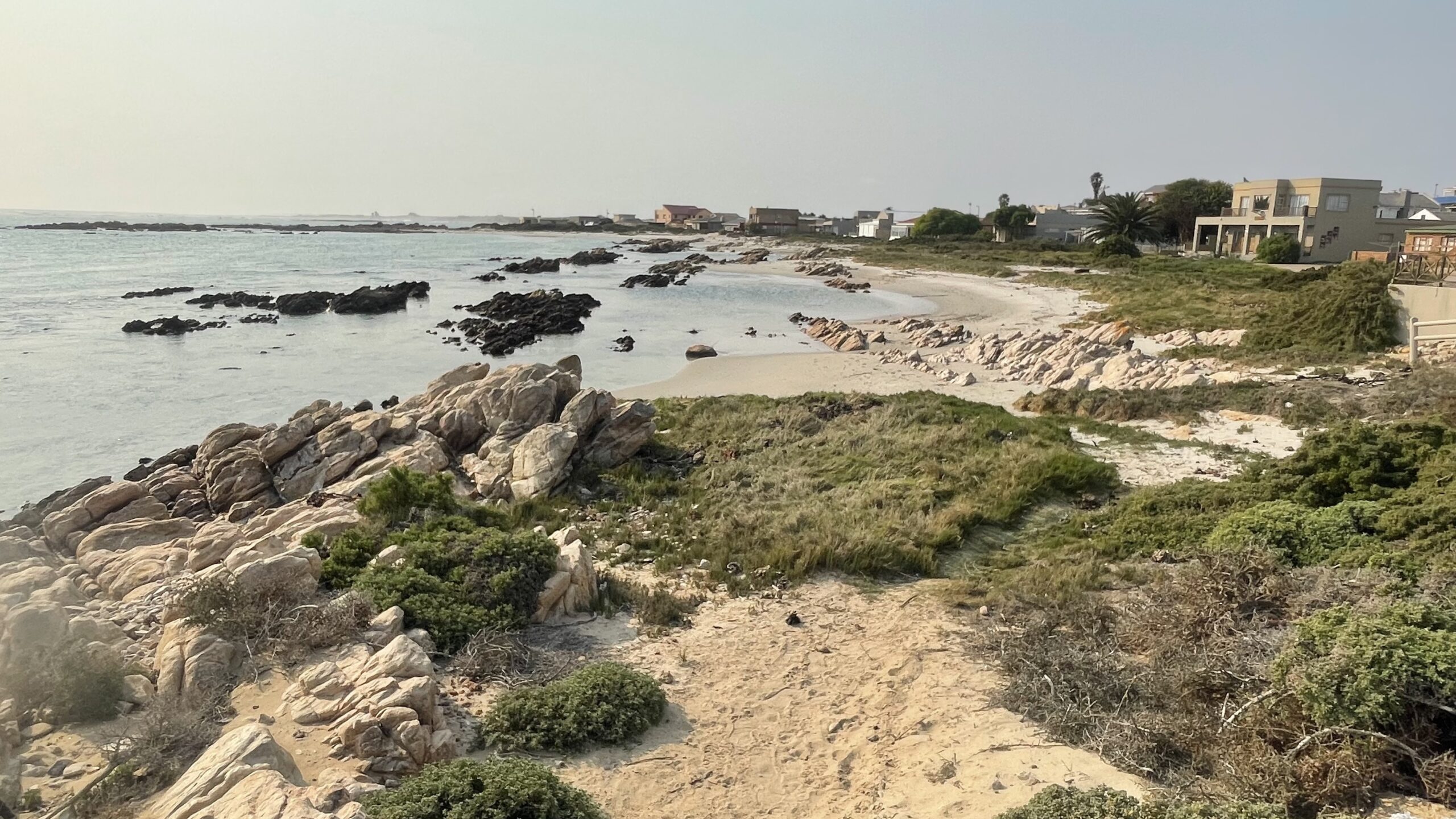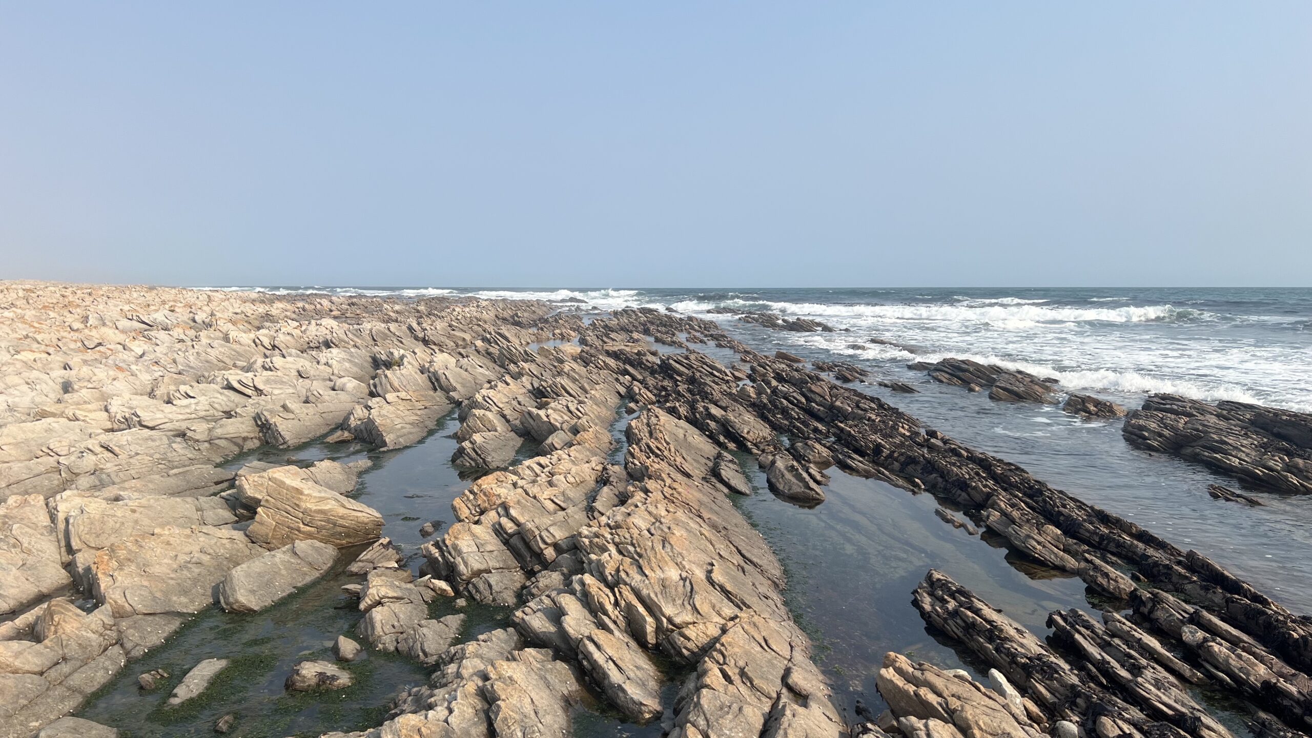 Von den Blumenwiesen in Namaqua fahren wir die Richtersveld-Route hinunter zur Küste in das kleine Hafen- und Ferienstädtchen Port Nolloth. Zu unserer Überraschung sind die Unterkünfte hier gut gebucht und erst nach ein paar Anläufen finden wir ein nettes Ein-Zimmer Beachhouse , das aber nicht – wie der Name vermuten ließe – am Strand gelegen ist, sondern erst in der dritten Reihe. Für eine Nacht passt das Mini-Appartement aber sehr gut als Ausgangspunkt für einen Spaziergang am von abgeschliffenen Felsenformationen und Massen an Muscheln geprägten Strand. Dazwischen tauchen hin und wieder kleine, flache Sand- und Kieselbuchten auf, in denen das Wasser gar nicht mal so kalt fürs Baden wäre. Die glatte Oberfläche des klaren Salzwassers schimmert verlockend. Doch draußen, jenseits der Felsen tobt eine heftige Brandung. Wir hören das Tosen der Wellen, deren weiße Kämme an der Riffkante brechen.