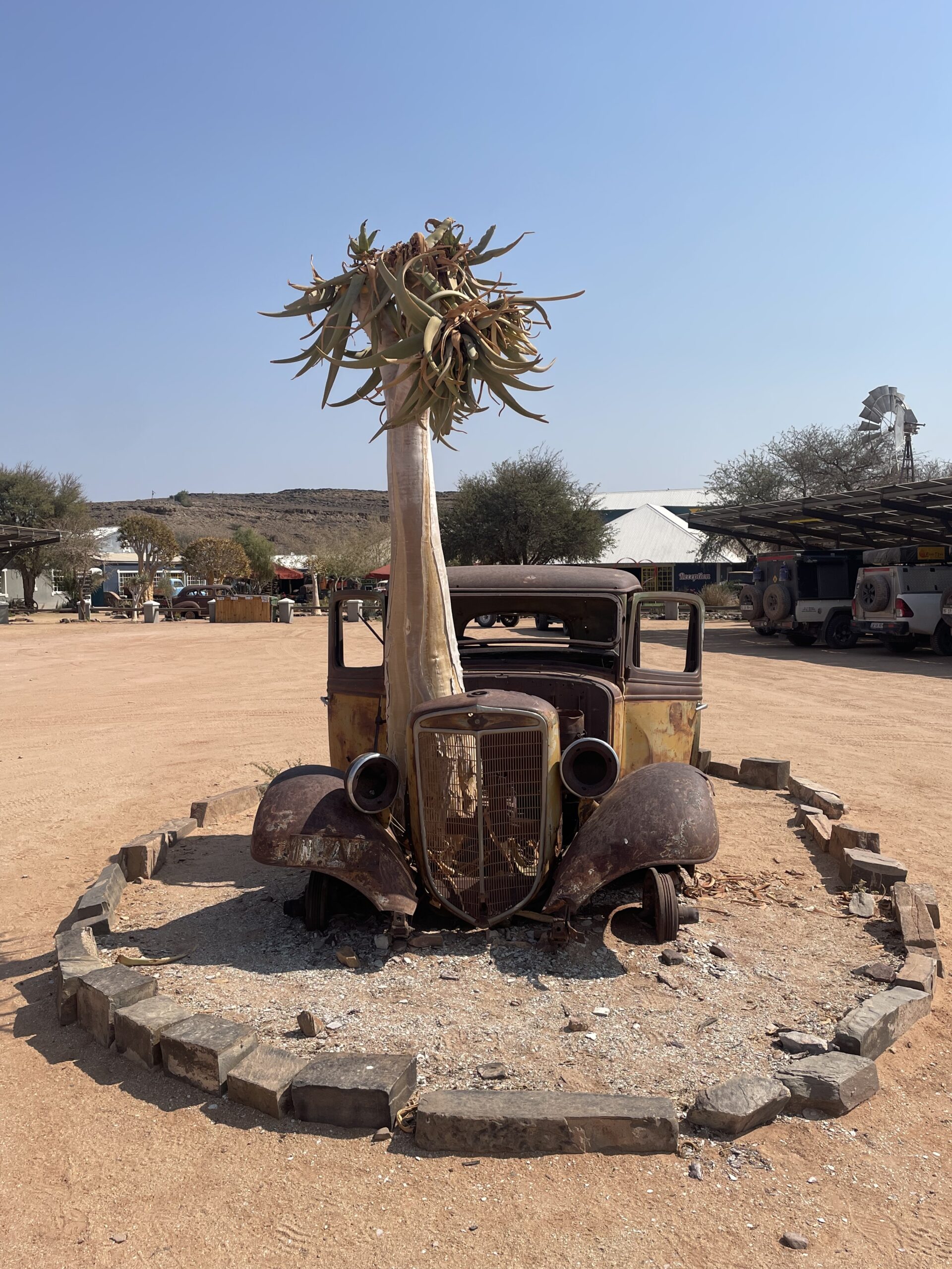 Das NWR-Camp am Canyon in Hobas ist nett und wir sind froh, zwei Nächte gebucht zu haben. So haben wir untertags genug Zeit, auch zu schwimmen (der kleine Pool ist wieder nur was für Eisschwimmer, also kein Delfin im Wasser…), zu lesen und ein bisschen zu dösen, zumindest bis zur Ankunft von zwei randvoll besetzten Overlander Trucks, die direkt gegenüber von uns unter lautem Geklimper von Zeltstangen, krachend vom Dach fliegenden Packsäcken sowie aufgeregtem Gekicher und vielsprachigem Geschnatter ihr Lager aufschlagen. Es stört uns nicht weiter, denn diese Tourgruppen fallen wie ein Schwarm Hornissen spät am Tag ein und sind üblicherweise frühmorgens auch wieder weg. Afrika in 14 Tagen….