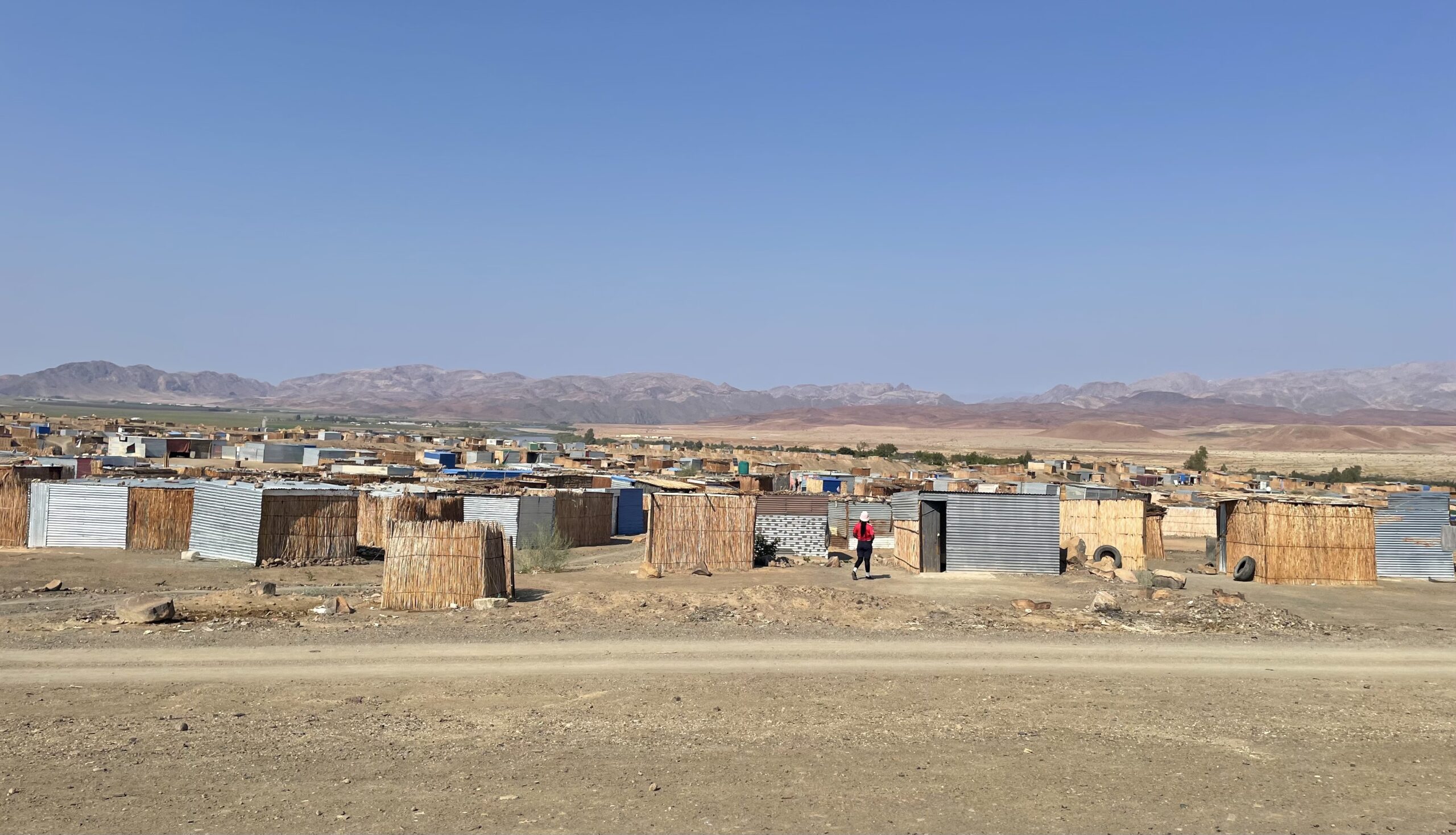 Die Pläne, den Oranje entlangzufahren und dort zu übernachten, müssen wir am nächsten Tag leider begraben, da die Tankstelle des Ortes nur Diesel im Angebot hat – nicht ganz nach Lunas Geschmack. Wir befragen unser GPS, das uns die nächste Tankstelle in Ais-Ais Resort anzeigt. Das liegt an unserer Strecke und so machen wir uns früher als geplant auf zum Fish River Canyon. Aussenkehr ist – wie der Name schon andeutet – ein ziemlich gottverlassener Ort. Der Spar-Supermarkt ist sichtlich das modernste Gebäude, der Rest rundherum ist von der Straße bis zum Fluss eine Slum-Siedlung mit Hütten aus Blech, Stroh und Karton. Hier leben bestimmt tausende Landarbeiter der Plantagen, in denen die Trauben gezogen werden, die sich später in den Regalen der europäischen Supermärkte wiederfinden.