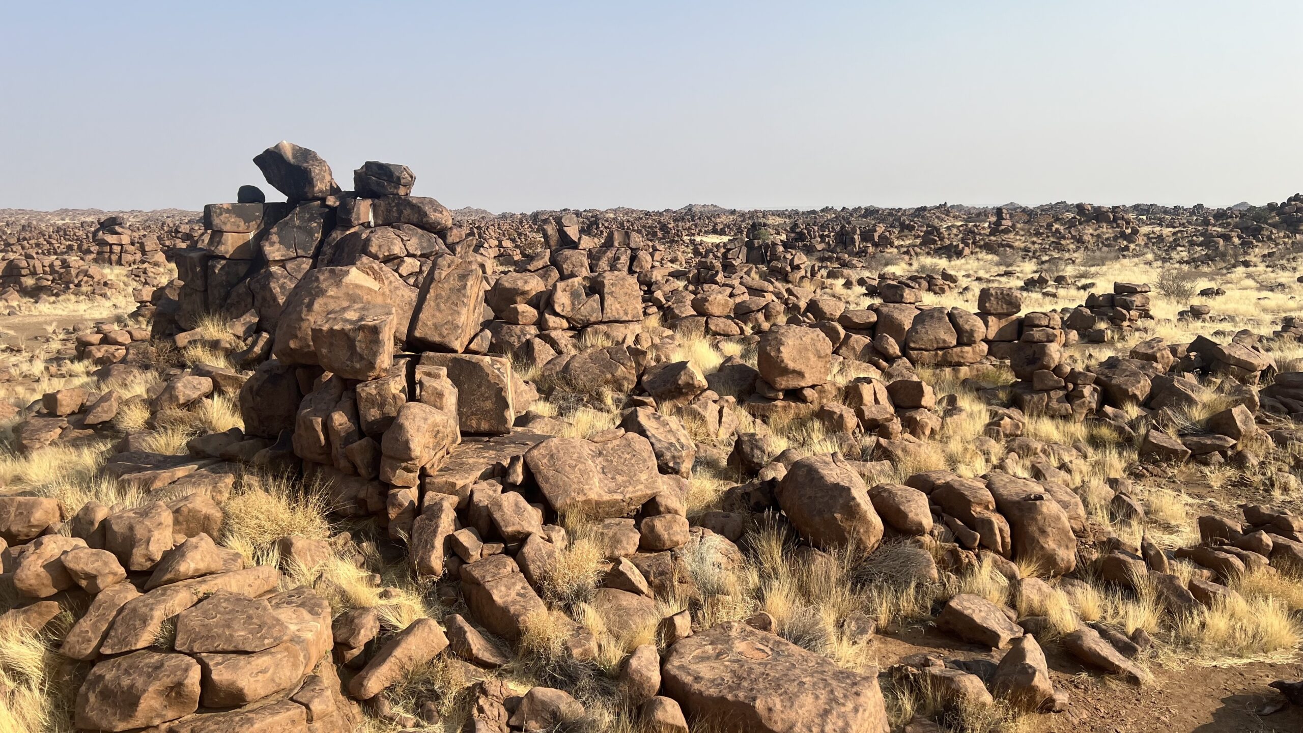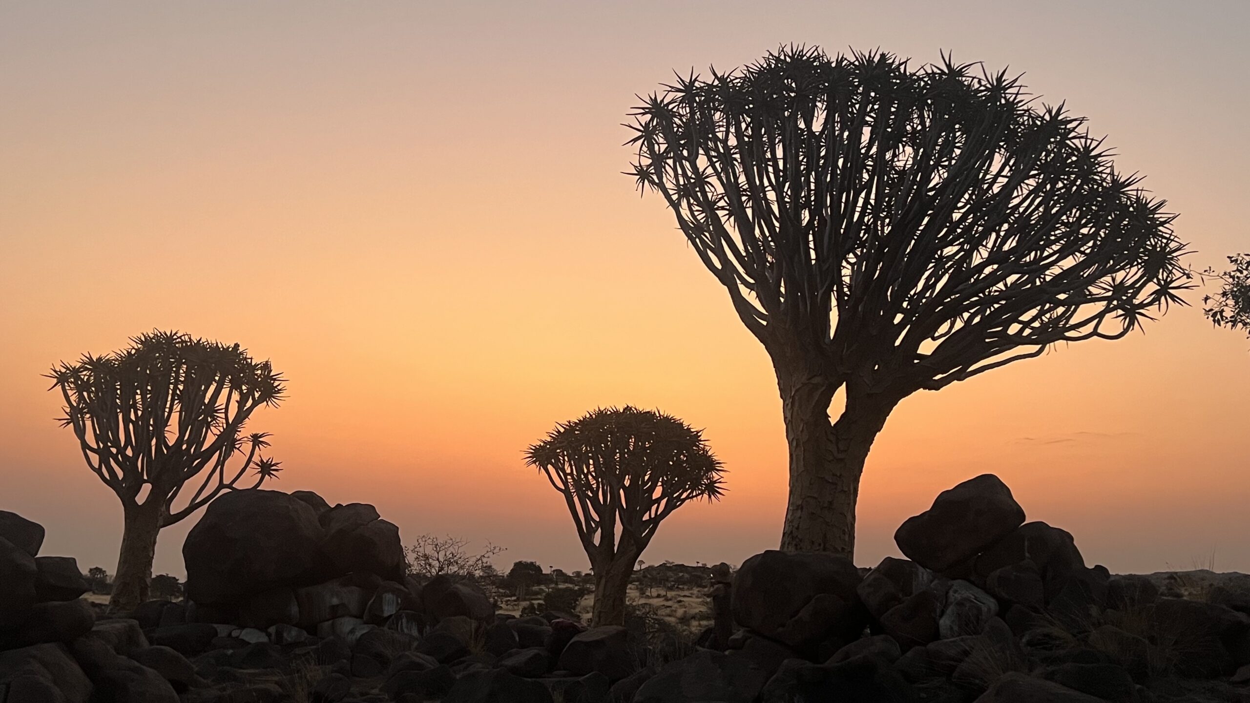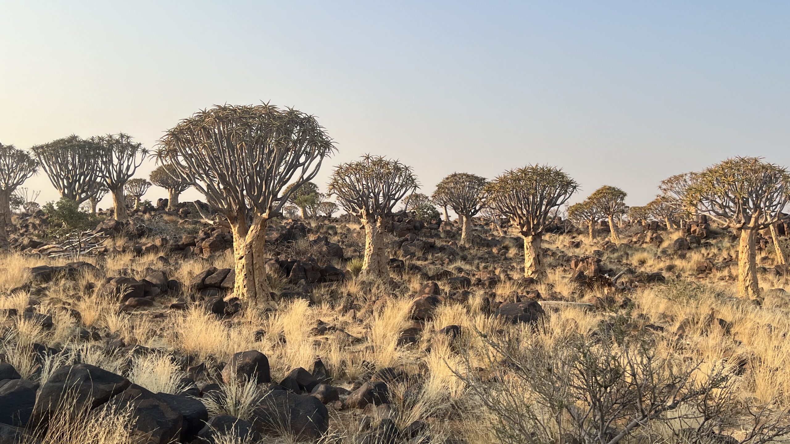 Erleichtert sehen wir in der Früh, dass der Bus nicht mehr da ist. Dem Reiseleiter ist es offenbar noch gelungen, seine bestens gelaunt durch die nächtliche Landschaft stolpernden Schäfchen wieder einzusammeln. Der Köcherbaumwald liegt wieder vollkommen friedlich und malerisch in der Morgensonne, als auch wir vom Gelände rollen und die Fahrt aufnehmen zurück zum Atlantik.