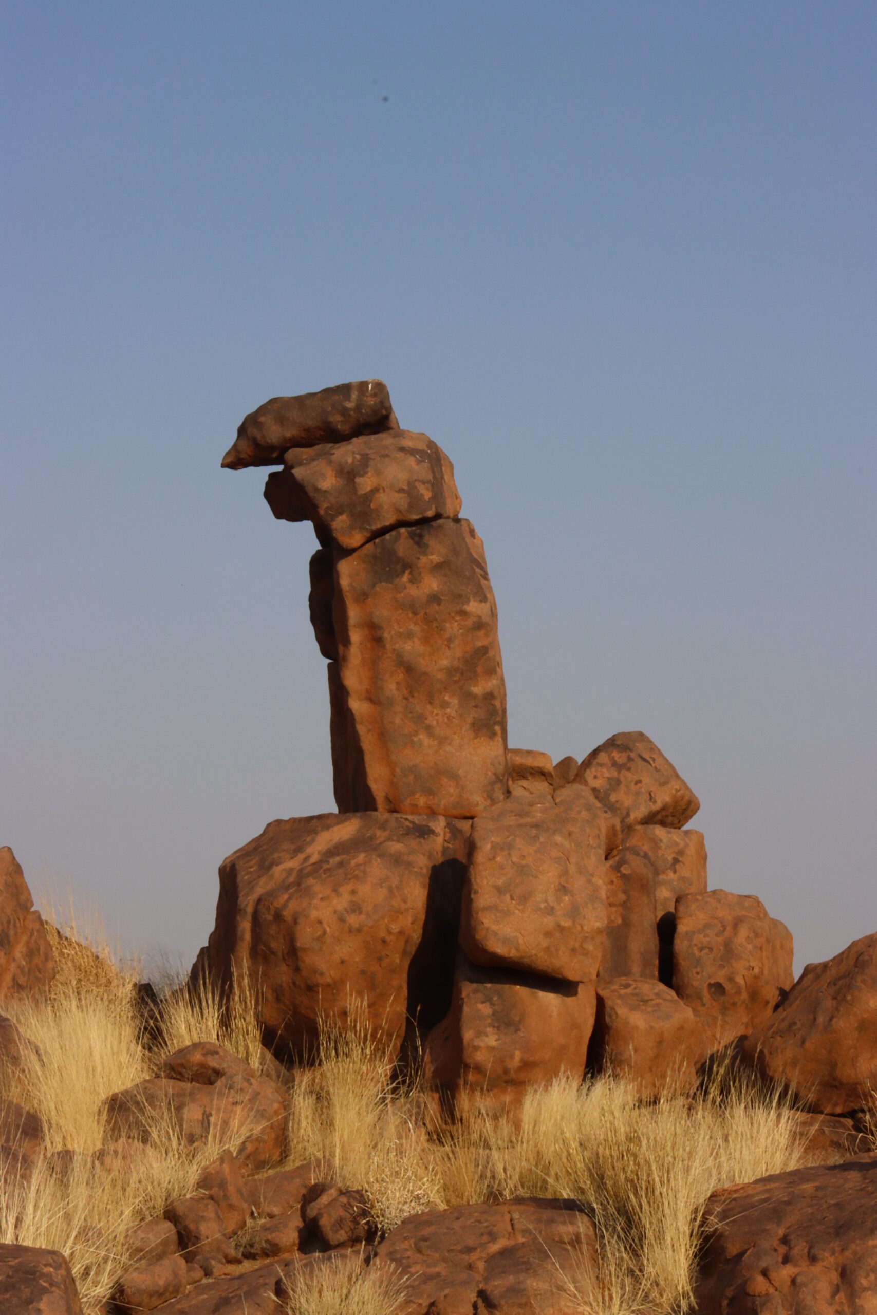 Wir machen uns auf zu unserem Nachmittagsausflug. Nur rund fünf Kilometer entfernt durchstreifen wir das wundersame Dolerit-Labyrinth des „Giants´ Playground“, klettern auf einige der Felsformationen, beeindruckt von der Weitläufigkeit des Gebiets. Nur gut, dass hin und wieder ein Wegweiser auftaucht, der uns wieder auf den eigentlichen Rundkurs leitet. Überall finden sich neue Motive der steinernen rot-braunen Felsen, die tatsächlich den Eindruck erwecken, als hätten hier Riesen mit gigantischen Bauklötzen gespielt. Hier thront ein Wanderschuh (Schuhgröße 448), da ein überdimensionaler Fußballschuh, der zugehörige Ball liegt nicht weit davon, dort ein frecher Riese, der dem Schiedsrichter die Zunge rausstreckt. Der Fantasie sind keine Grenzen gesetzt. Es macht Spaß, in diesem Riesen-Spielplatz herumzuwandern.