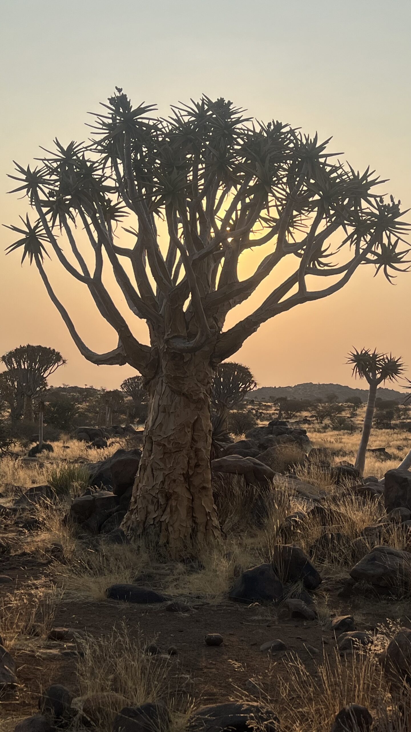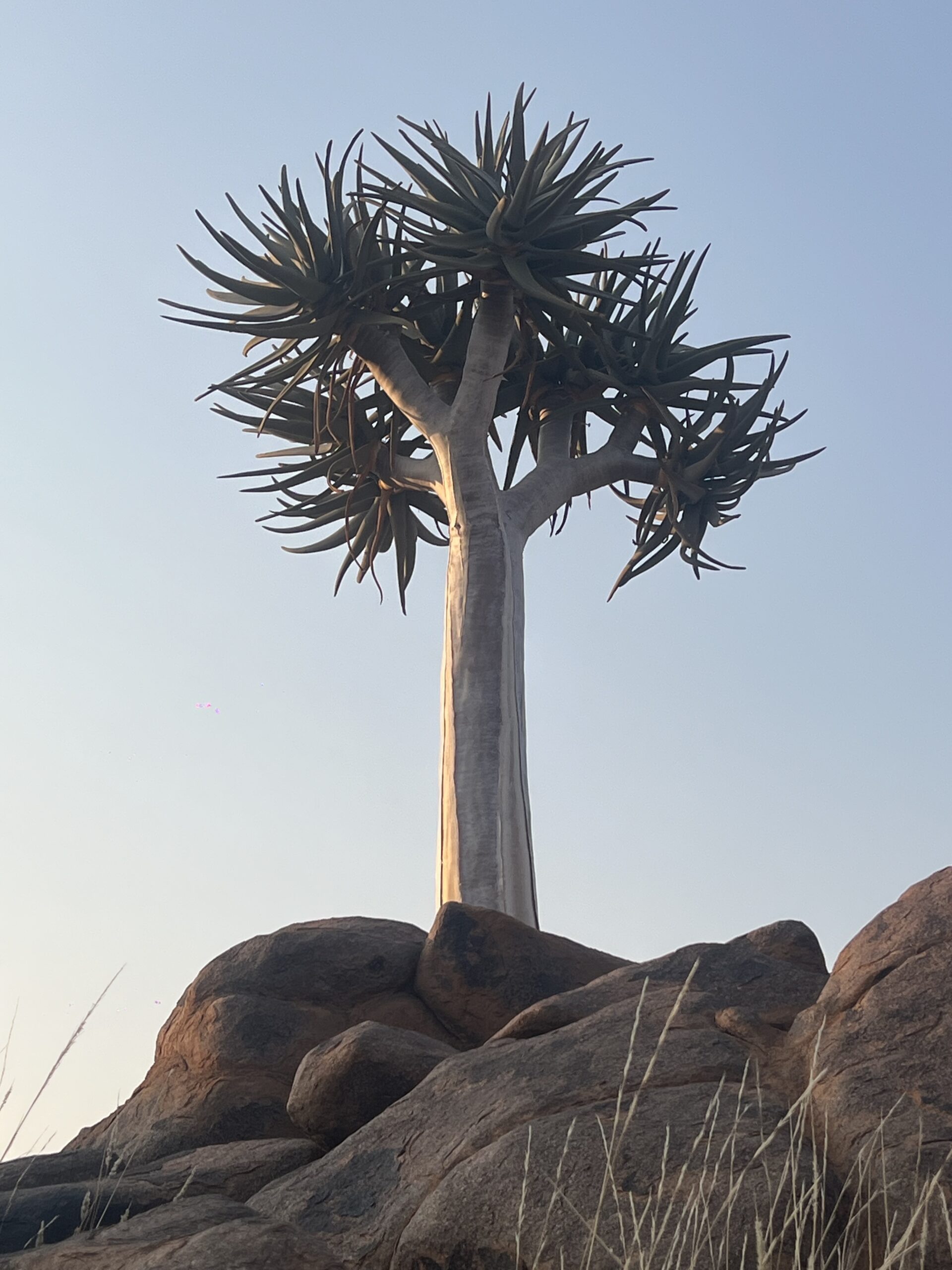 Wir müssen aber weiter, denn die Hauptattraktion ist eindeutig der Köcherbaumwald auf dem Gelände neben unserem Campsite. Den haben wir uns für die Abendstunden aufgehoben, wenn die Sonne tiefer steht und die Stämme der wundersamen Bäume in ein goldiges Licht taucht. Der Wald ist zurecht als „National Monument“ ausgewiesen. In unterschiedlichster Größe stehen die einzigartigen Bäume hier auf dem steinigen Untergrund in einer Dichte, die wir zuvor noch nie gesehen haben. Die hellen Wurzeln umklammern die Felsbrocken und krallen sich im kargen boden fest. Ich frage mich, wie alt die größten wohl schon sind, abgebrochene Äste im unteres Stammbereich zeigen Jahresringe für locker 70 Jahre. Es ist ruhig, nur wenige andere Camper schauen sich im Wald um und versuchen, die besten Foto-Motive zu finden. Wir kraxeln auf einen schönen Sundowner-Felsen und stoßen mit den Savannas an. Auf einmal knirschen Schritte hinter uns und es zwitschert zuckersüß mit chinesischem Akzent:“ OooOh, this looks soooo butifuuul! Mee ai teek a pictu of yuuu tuuu?“ – und schon klickt es. Uns blieb gar keine Zeit für eine Antwort. Wen interessieren schon Köcherbäume?