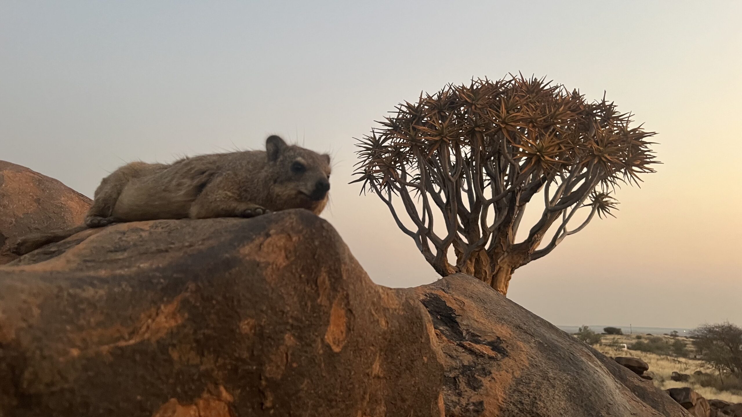 Wir lachen und schauen weiter der Sonne beim Herabsinken zu.Dassies laufen aus dem Busch in unsere Richtung auf ihre Schlaffelsen, scheinen sich aber ebenfalls immer wieder Zeit zu nehmen, um den Sonnenuntergang zu bewundern. Das Hintergundrauschen von beigeisterten Ausrufen wird immer mehr, nun nähert sich eine ganze Busladung Chinesen. Der „Butiful Spot“ hat sich herumgesprochen und jetzt muss natürlich jeder und jede (es sind geschätzt 25 Personen in so einem Bus) genau hier auch so ein Foto haben. Unterschiedliche Posen werden probiert und das Ergebnis des shootings sogleich kichernd kontrolliert und eifrig kommentiert. Gegebenenfalls bedarf es einer Wiederholung, wenn die Handtasche oder der flatternde Rock vom ignoranten Fotografen falsch in Szene gesetzt wurden. Aber gut, die Sonne ist noch da, als die schnatternde Horde um einige Köcherbäume weiterzieht. Die Dassies blieben unbemerkt. Wir klettern von unserem Dassie-Rock, um ihn wieder den possierlichen Tierchen zu überlassen. Erstaunlich nahe lassen sie uns an sich herankommen, beinahe zum Anfassen.
